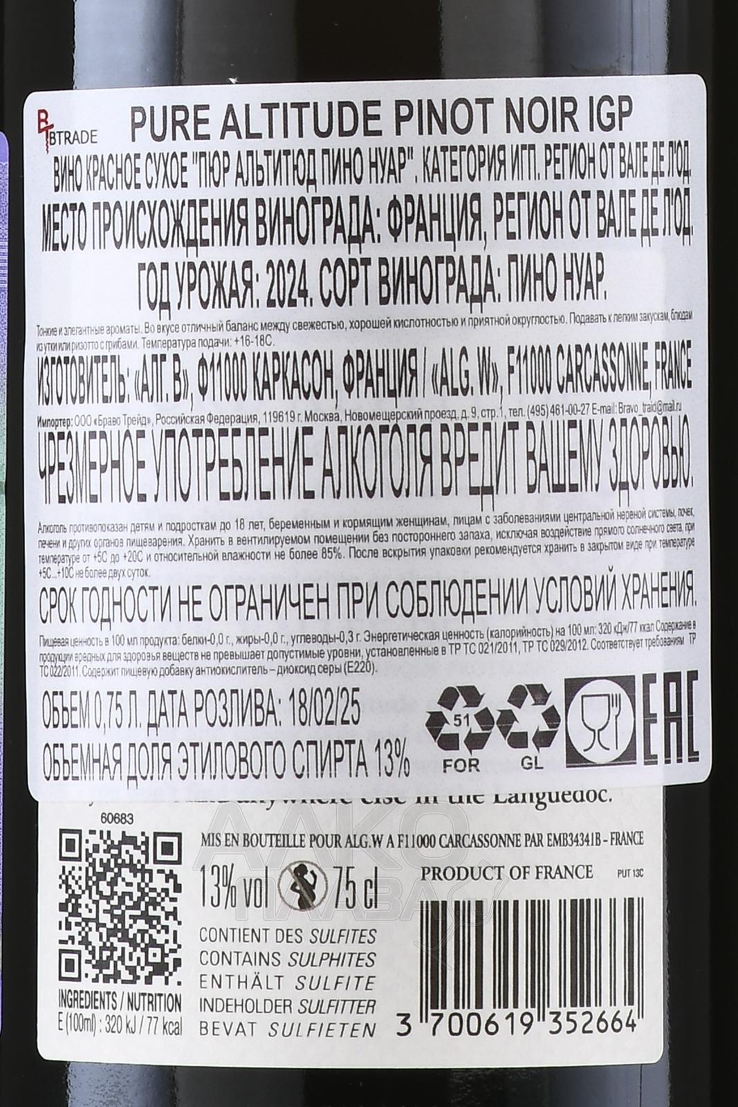 Pure Altitude Pinot Noir - вино Пюр Альтитюд Пино Нуар 0.75 л красное сухое
