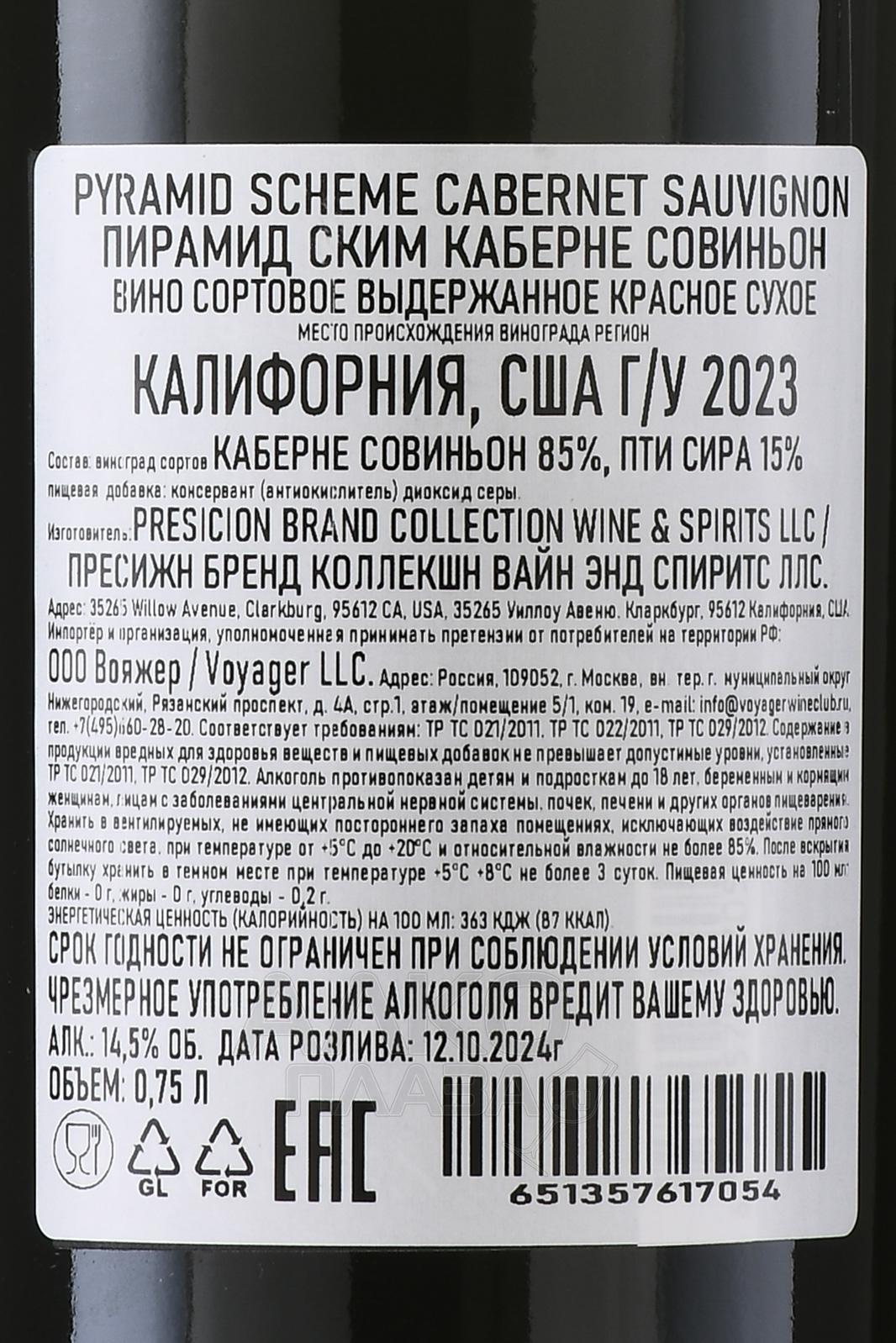 Белое сухое вино Pyramid Scheme Cabernet Sauvignon 0,75 л создано ограниченным тиражом из винограда, выращенного в солнечных долинах Калифорнии. Этот сорт, традиционно использовавшийся в Бордо, а затем распространившийся по всему миру как одна из основных составляющих красного вина, здесь прошел белую винификацию — сок был отделен от кожуры сразу после дробления, что позволило сохранить свежий вкус и легкий цвет. Урожай собрали вручную в год с умеренно теплым летом и прохладными ночами, что обеспечило баланс сахара и кислотности. Почвы участка состоят из песчаного суглинка с включениями гравия, что улучшает дренаж и концентрирует вкус ягод. Ферментация проходила в нержавеющих емкостях при низкой температуре, чтобы сохранить тонкие фруктовые ноты и свежесть букета. Выдержка на осадке в течение нескольких недель придала напитку легкую текстурную глубину.