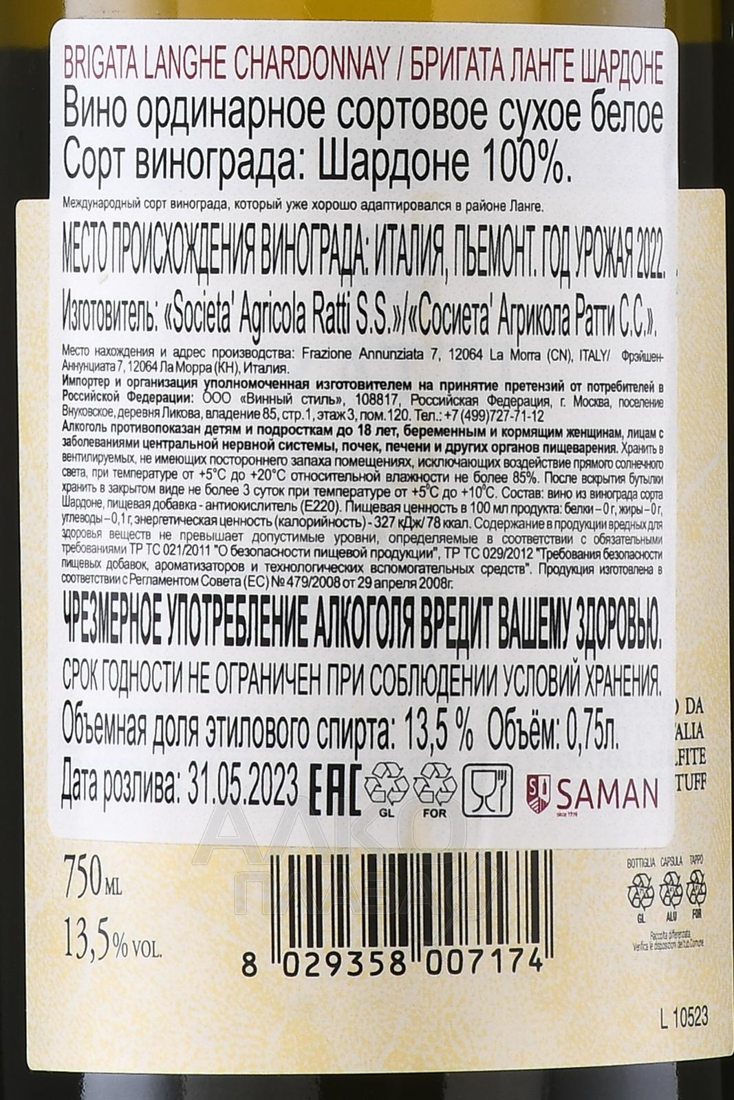 Белое сухое вино Ratti Brigata Langhe Chardonnay 0,75 л – элегантное вино из региона Ланге в итальянском Пьемонте. Производится на винодельне Ренато Ратти. Ягоды собирают вручную с виноградников близ Ла-Морра, расположенных на глинисто-известковых почвах. Такой терруар характерен умеренным климатом с жаркими днями до 25 °C и прохладными ночами около 15 °C, что обеспечивает баланс вкуса и кислотности. После сбора виноград мягко прессуют, ферментация отжатого сока проходит в стальных резервуарах без выдержки в дубовых бочках, чтобы подчеркнуть чистоту фруктовых ароматов.