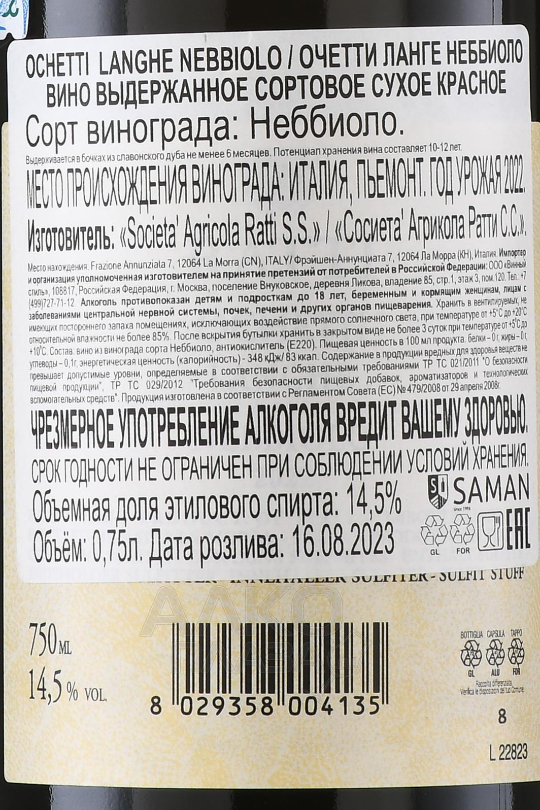 Красное сухое вино Ratti Ochetti Langhe Nebbiolo 0,75 л – яркий образец из региона Пьемонт на северо-западе Италии. Виноград выращен на песчаных почвах холмов зоны Ланге, слева от реки Танаро. Благодаря отличному дренажу почвы ягоды набирают насыщенность и баланс. Урожай собирают вручную с конца сентября до середины октября. После традиционной ферментации при контролируемой температуре около 30 °C и мацерации, длящейся до 10 дней, вино выдерживают примерно год в дубовых бочках. В год сбора винограда погодные условия были умеренными, с умеренным количеством дождей и прохладным летом, что позволило сохранить свежесть и высокую кислотность вина.