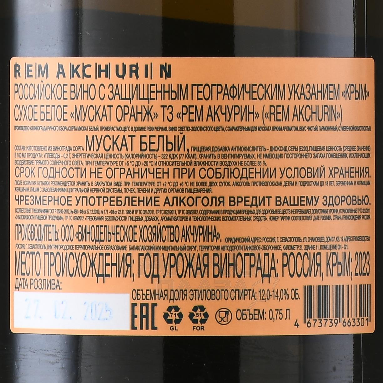 Белое сухое вино Rem Akchurin Muscat Orange 0,75 л является оранжевым по способу производства. В качестве сырья для него использовался сорт Мускат с виноградника в центральной части долины реки Черная. Это уникальный терруар в Севастопольском районе с аллювиальными почвами и мягким климатом, на который влияет близость Черного моря. Благодаря соседству с двумя водоемами лозы не нуждаются в дополнительном орошении. Они были посажены более 10 лет назад на наиболее удобных и подходящих участках. Сбор урожая — ручной, проводится на пике спелости. Винификация включала в себя длительную мацерацию на кожице, за счет которой вино приобрело яркий цвет и легкую танинность.