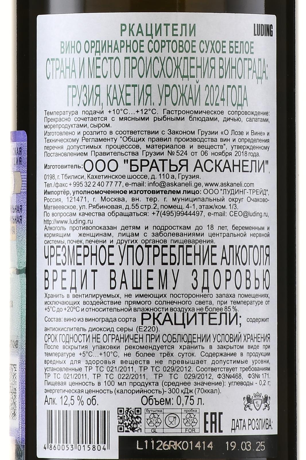 Белое сухое вино Ркацители Братья Асканели 0,75 л представлено в классической коллекции крупного грузинского бренда Askaneli Brothers. Оно создано из одного сорта винограда, выращиваемого в Кахетии в особых природно-климатических условиях, влияющих на органолептику и стиль. Процесс производства регулируется на основании национального закона «О лозе и вине». Сырье собирали на пике спелости ранним утром, чтобы максимально свежим довезти его до винодельни. Винификация протекала в рамках традиционной технологии под постоянным присмотром главного специалиста компании. Вино длительное время выдерживалось в стальных резервуарах.