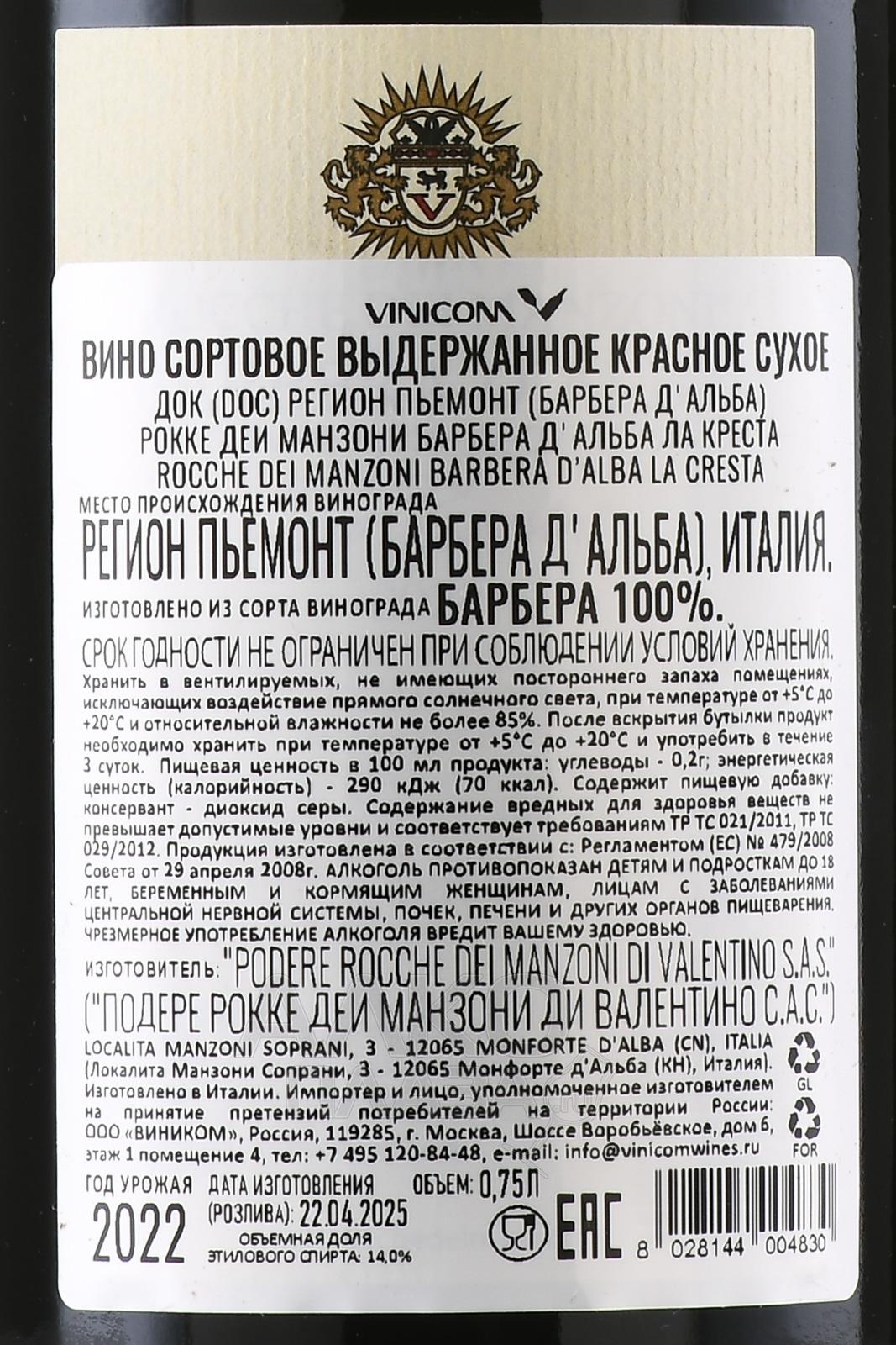 Красное сухое вино Rocche dei Manzoni Barbera d`Alba La Cresta 0,75 л создано в самом сердце Пьемонта, где традиции виноделия передаются из поколения в поколение. Одна из популярных в регионе лоз, чьи урожаи идут на винификацию, выращивается здесь на холмах Ланге, сложенных известняковыми и глинистыми почвами, которые придают урожаю глубину и выразительность. Континентальный климат с жарким летом и прохладной осенью позволяет ягодам дозревать равномерно, сохраняя баланс сахара и кислот. В год сбора погода была стабильной: весна с умеренными дождями помогла лозам укрепиться, а сухое лето с редкими грозами обеспечило идеальные условия для концентрации аромата. Напиток прошел ферментацию в стальных емкостях и выдержку в дубе для округления вкуса и приобретения благородного стиля.