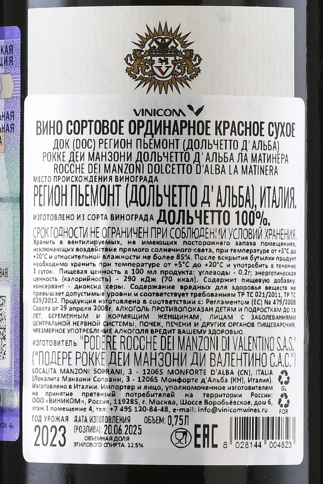 Красное сухое вино Rocche Dei Manzoni Dolcetto D`Alba La Matinera 0,75 л создано в винодельческом хозяйстве Пьемонта, где холмистые склоны и глинисто-известняковые почвы формируют характер винограда Дольчетто. Оно обладает чертами традиционного стиля региона: структурное, сдержанное и элегантное. Ферментация проводится в стальных емкостях при контролируемой температуре, что сохраняет свежесть и фруктовый профиль. Выдержка проходит недолго, что дает возможность подчеркнуть натуральные оттенки сорта. Уникальность вина в том, что оно отражает классическую интерпретацию Дольчетто с акцентом на чистоту вкуса. Ла Матинера не раз отмечалось критиками за баланс и гармонию.