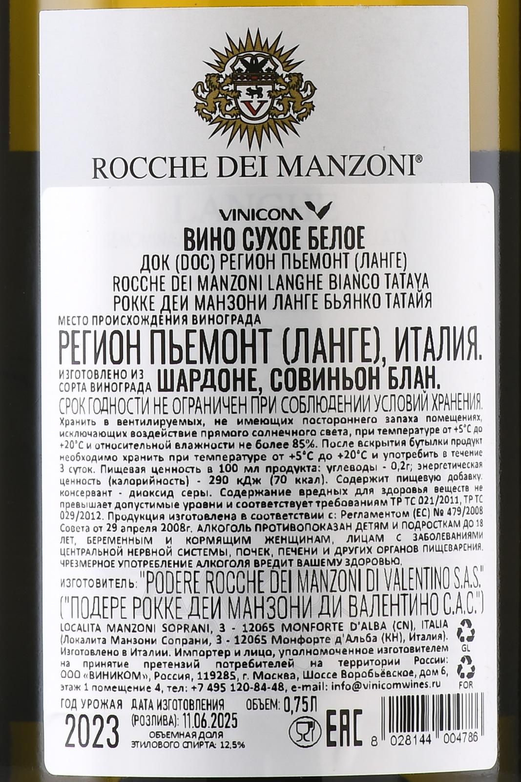 Белое сухое вино Rocche dei Manzoni Langhe Bianco Tataya 0,75 л — утонченное и одновременно насыщенное, сочетающее в себе свежесть, структуру и глубину вкуса. Виноград произрастает в холмистых зонах Ланге, на известково-глинистых почвах, которые придают ягодам яркость и минеральность. Урожай собирают вручную, ягоды проходят бережное прессование. Ферментация протекает в стальных емкостях при контролируемой температуре, что позволяет сохранить чистоту аромата и природную свежесть. Затем часть вина выдерживается в дубовых бочках. Его уникальность заключается в том, что производитель сочетает традиционные методы Пьемонта с современной технологией.
