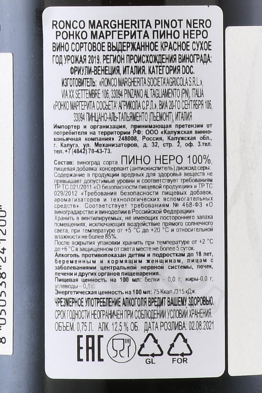 Красное сухое вино Ronco Margherita Pinot Nero 0,75 л создают из винограда с лоз, расположенных на холмах в регионе Фриули-Венеция-Джулия на севере Италии. Терруар характеризуется глинисто-известковыми почвами с песчаными слоями, богат минералами и имеет хороший дренаж. Сбор урожая проводится вручную в конце сентября после достижения ягодами оптимальной зрелости. Для винификации ягоды аккуратно прессуют и подвергают ферментации в стальных ёмкостях с контролем температуры. После мацерации и ферментации напиток выдерживается в дубовых бочках из французского дуба 12 месяцев и затем дополнительно отдыхает в бутылках не менее 6 месяцев.