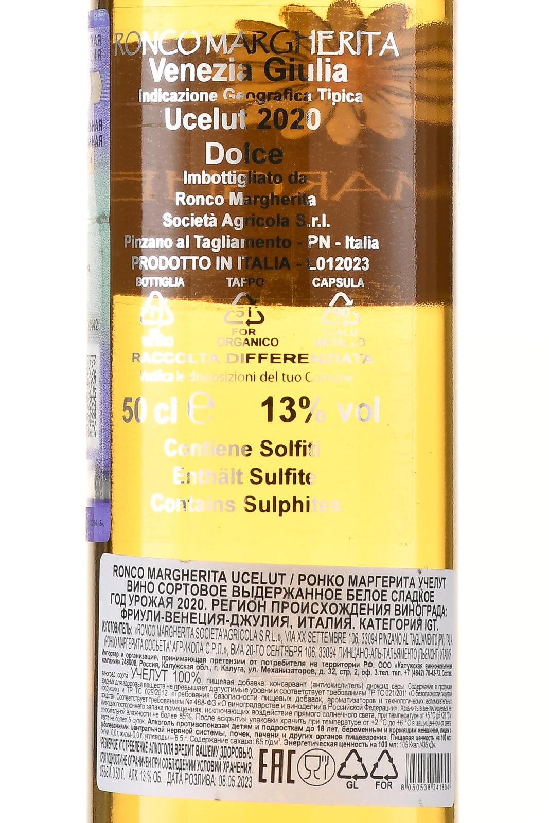 Белое сладкое вино Ronco Margherita Ucelut 0,75 л создано из 100% редкого автохтонного винограда региона Фриули‑Венеция‑Джулия. Лозы размещены по системе Гайо в плотности 5000 растений/га на глинисто-известковых почвах у подножья Доломитов, на высоте примерно 120–450 м над уровнем моря. Урожай, предназначенный для винификации, собирают в первых числах октября, ягоды оставляют на подвяливание около месяца благодаря микроклимату на склонах холмов Порденоне. После сушки сырье мягко прессуют вручную. Сусло сбраживают в небольших дубовых барриках, но не до конца, что позволяет сохранить остаточный сахар. Затем напиток выдерживают 18 месяцев на дрожжевом осадке — этот процесс придаёт структуру и мягкость, оттенённую дубовыми тонами.