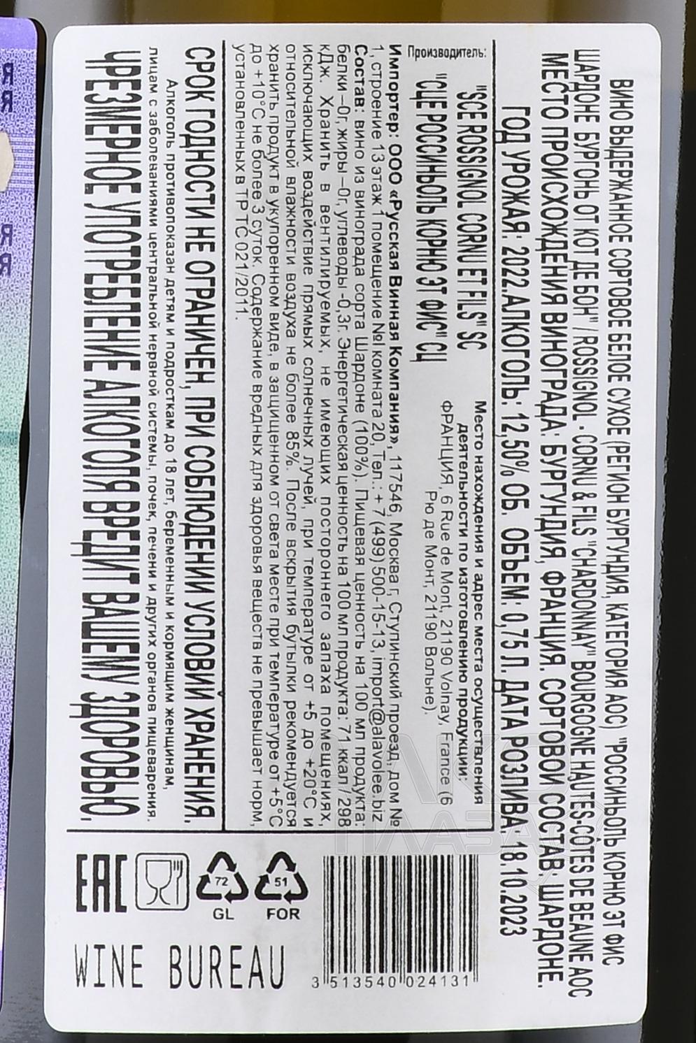 Rossignol-Cornu et Fils Bourgogne Chardonnay Hautes-Cotes de Beaune - вино Россиньоль Корню эт Фис Шардоне Бургонь От Кот де Бон 0.75 л белое сухое