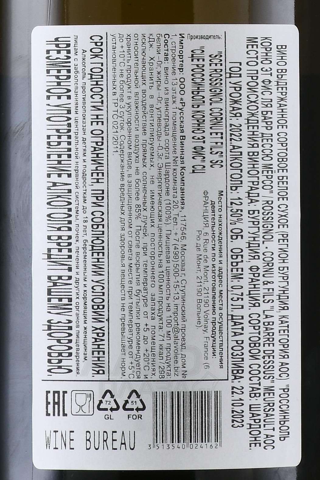 Rossignol-Cornu et Fils La Barre Dessus Meursault - вино Россиньоль Корню эт Фис Ля Барр Дессю Мерсо 0.75 л белое сухое