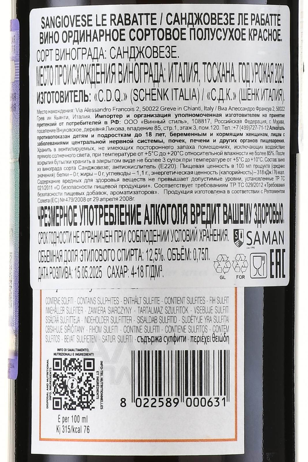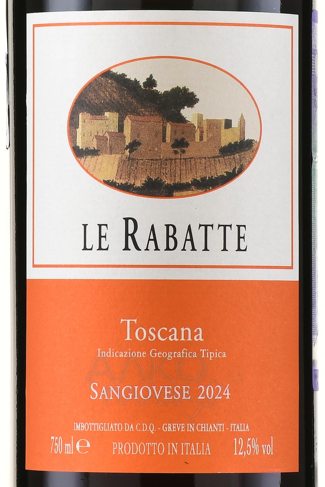 Красное сухое вино La Rabatte Toscana IGT Sangiovese 2021 г. 0,75 л произведено в Италии из одного сорта Санджовезе с виноградников в центральной части области Кьянти Классико. Был использован урожай конкретного года, указанный на этикетке. Лозы растут на склонах холмов на высоте около 300 м. Сбор ягод — ручной, винификация — классическим способом. Молодое вино не проходит выдержку в дубе и сохраняет яркость, свежесть и сортовые характеристики винограда.