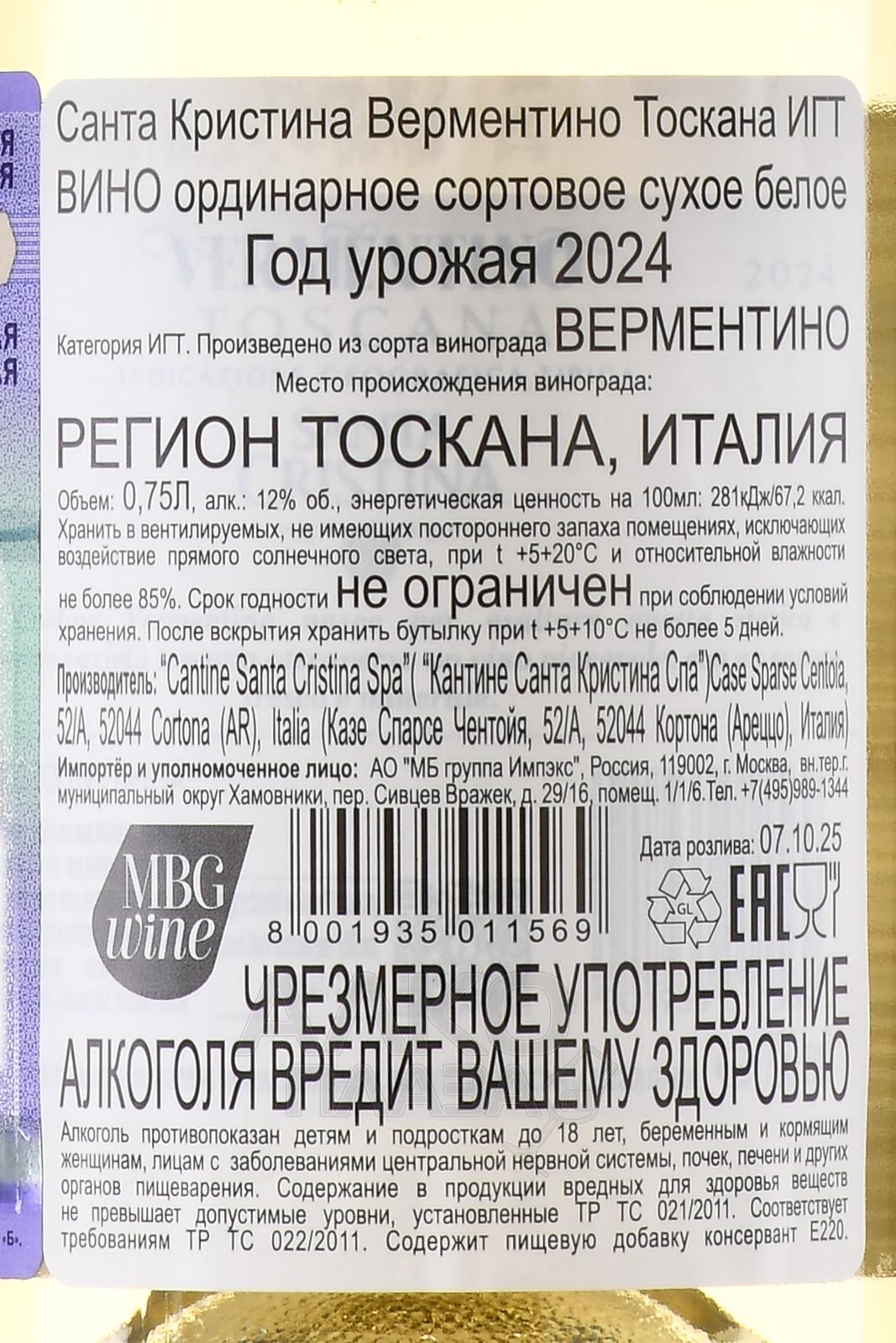 Santa Cristina Vermentino Toscana IGT - вино Санта Кристина Верментино Тоскана ИГТ 0.75 л белое сухое