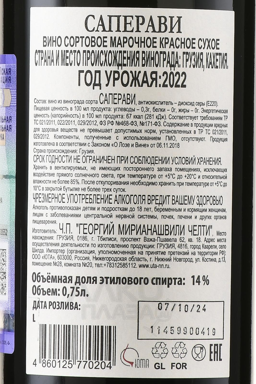 Красное сухое вино Saperavi Chelti Family Collection 0,75 л – выразительный сорт спиртного из культового грузинского автохтонного винограда с темной кожицей и насыщенно-окрашенным соком. Вариация изготовлена по европейской технологии – путем ферментации в стальных емкостях с возможностью термоконтроля. Богатый кахетинский терруар, щедрая сортовая органолептика ягод, собранных чуть раньше наступления полной спелости, и выдержка в течение как минимум 1,5 лет способствовали созданию напитка с ярким и узнаваемым характером.