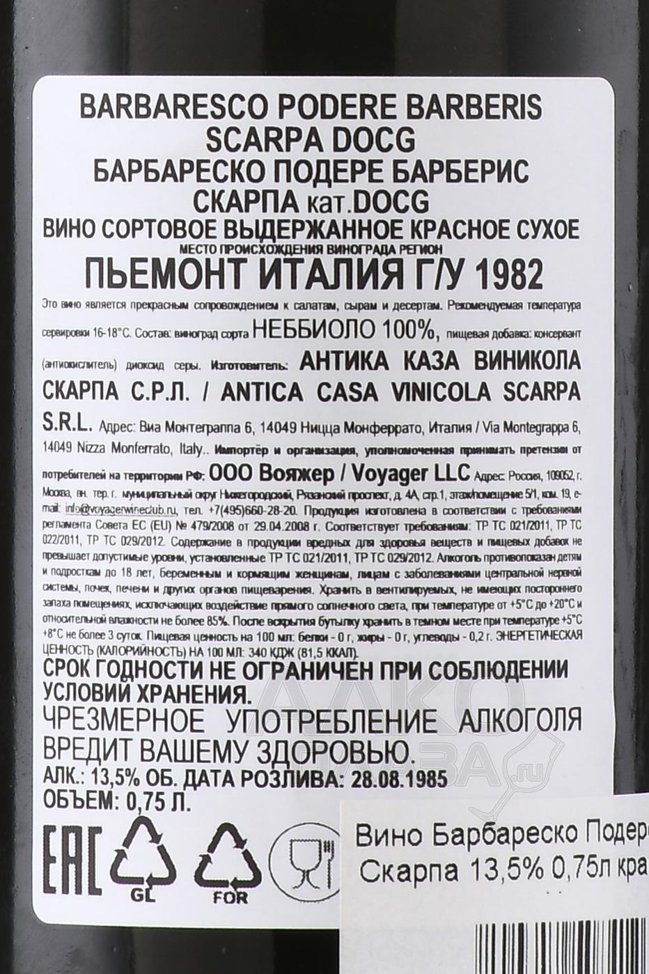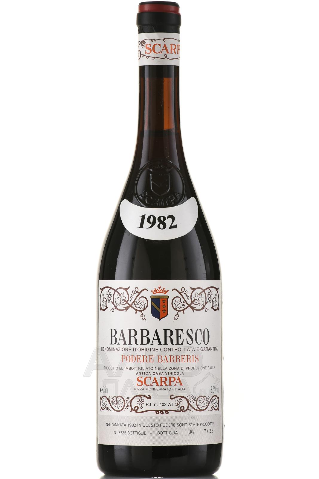 Красное сухое вино Scarpa Barbaresco Podere Barberis 1982 год 0,75 л — выдержанный образец категории DOCG из отборного винограда сорта Неббиоло, выращенного на южных склонах Пьемонта, в зоне Барбареско. Урожай собирается вручную с виноградников, расположенных на высоте около 300 метров над уровнем моря, на известняково-глинистых почвах с хорошей водопроницаемостью. Не менее 24 месяцев после ферментации напиток выдерживается в больших бочках из славонского дуба, а затем дозревает в бутылке.