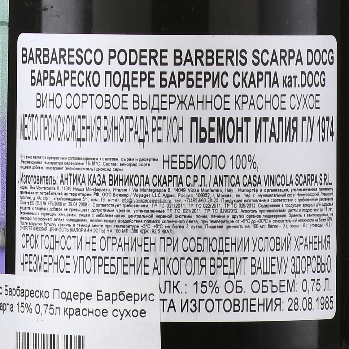 Красное сухое вино Scarpa Barbaresco Podere Barberis 1974 год 0,75 л отличается строгой структурой и элегантностью. Напиток произведён из винограда сорта Nebbiolo на склонах региона Барбареско в Пьемонте. Эти земли сложены известняково-глинистыми отложениями эры тортона, что придаёт ягодам минеральную точность. Урожай, собранный в тёплом, но не жарком году, созрел в условиях умеренной влажности и суточных колебаний температур, что обеспечило полноценное формирование плодов со свежее кислотность. и яркой ароматикой. Ферментация проходила в традиционных дубовых бочках, с выдержкой не менее двух лет.