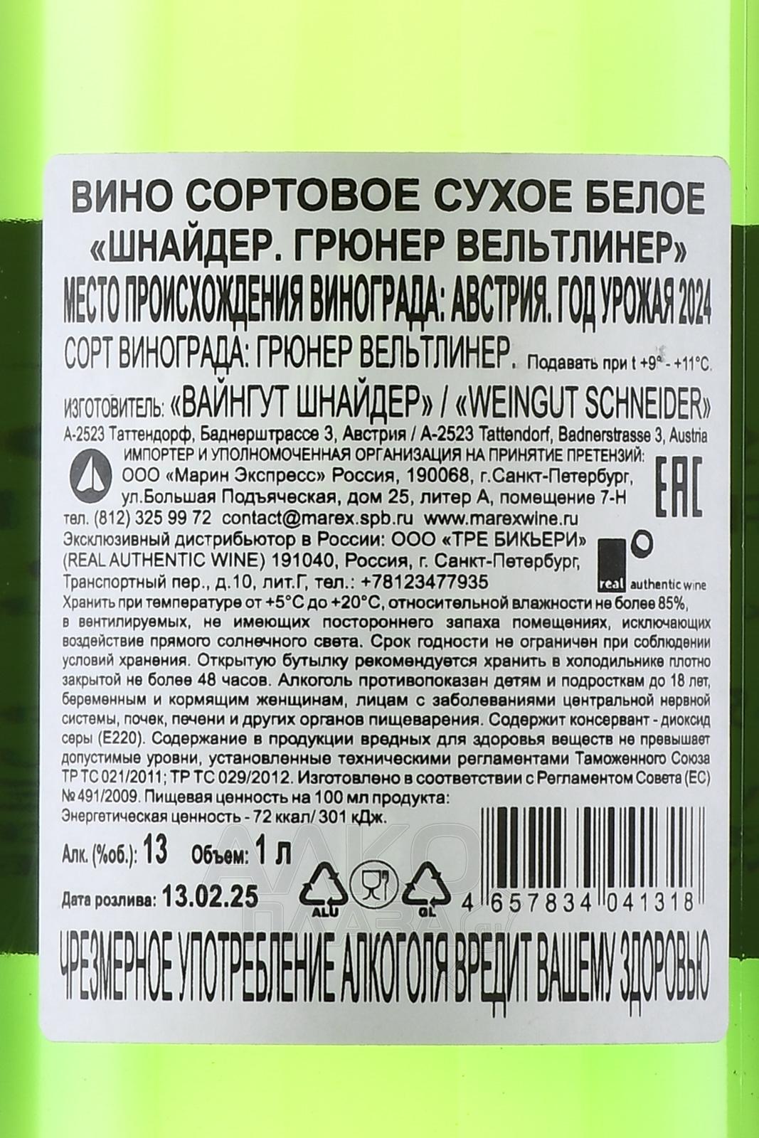 Белое сухое вино Schneider Grüner Veltliner 1 л — живая и искренняя интерпретация австрийской классики. Напиток рождается на виноградниках семейного предприятия в регионе Бургенланд, недалеко от границы с Венгрией. Сланцево-известняковые с гравийно-галечными включениями почвы обеспечивают дренаж и минеральную основу. Виноград выращивают по принципам устойчивого земледелия, без использования гербицидов. Урожай собирают вручную, ряды обрабатывают выборочно. Ягоды сразу направляют на прессование, после чего сусло подвергается ферментации в стальных резервуарах при контролируемой температуре.