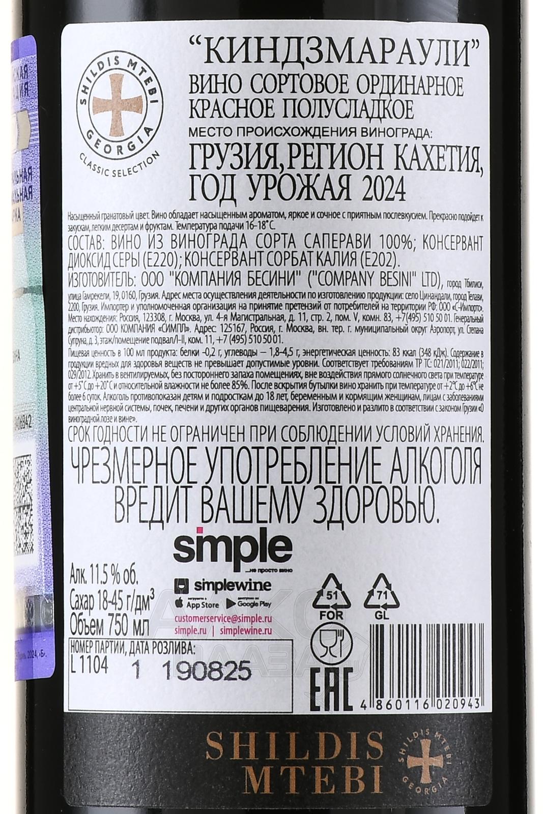 Красное полусладкое вино Shildis Mtebi Kindzmarauli 0,75 л с уровнем крепости 11,5% — популярная разновидность грузинского спиртного на основе автохтонного винограда Кахетии, собранного в течение ограниченного урожайного сезона на территории Киндзмараульской микрозоны (Кварельский район). Для создания напитка применялись только ягоды, достигшие сахаристости в 22%. Их подвергли традиционной винификации при термоконтроле.