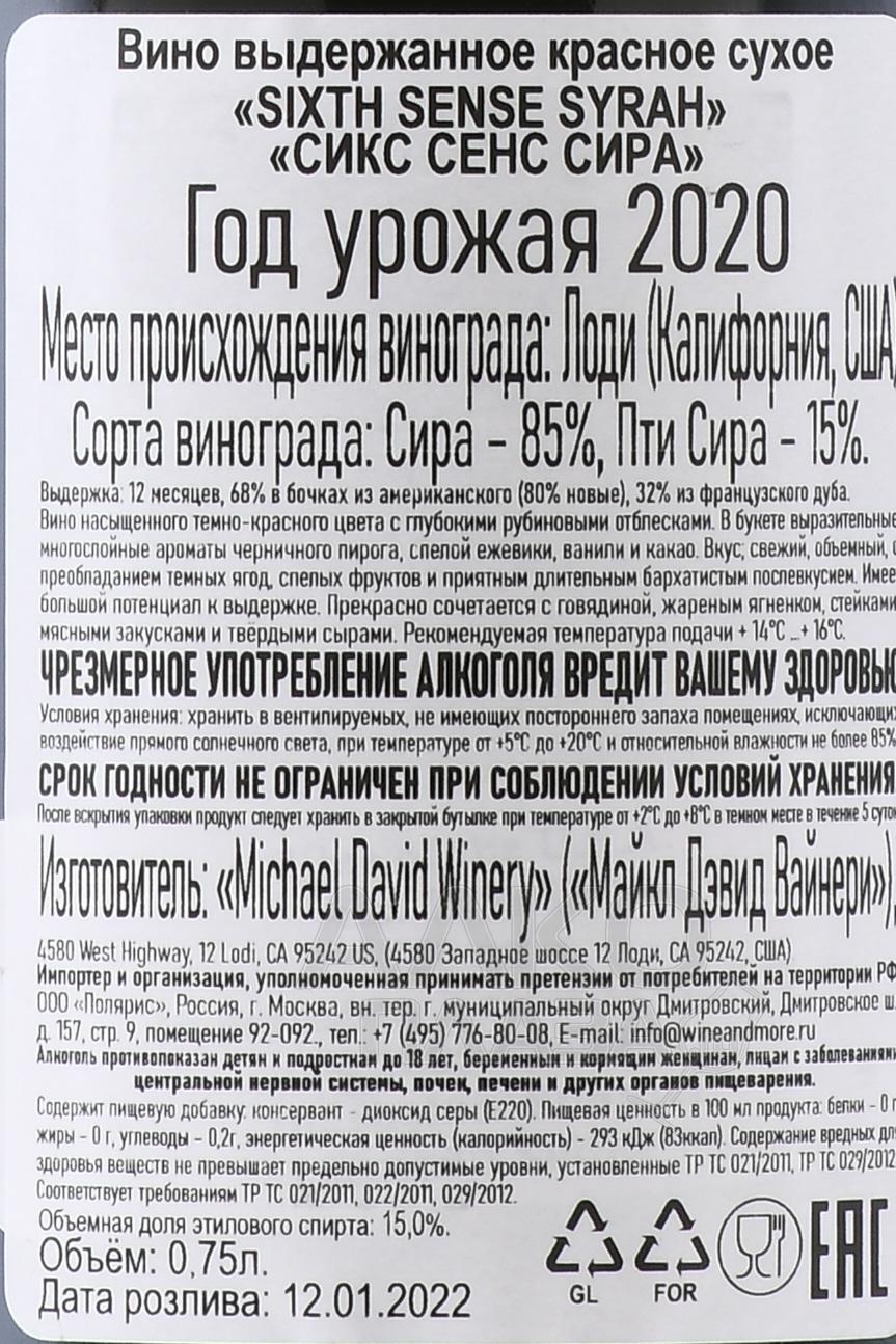 Красное сухое вино Six Senses Syrah 0,75 л отличается глубоким и насыщенным характером. Основой для напитка служит виноград сорта Syrah, выращенный в калифорнийском регионе Лоди. Терруар виноградников — аллювиальные почвы с хорошим дренажем, климат средиземноморского типа с жаркими днями (до +35 °C) и прохладными ночами (около +15 °C). Выдержка купажа составила 16 месяцев в бочках из французского дуба, 60% из которых — новые.