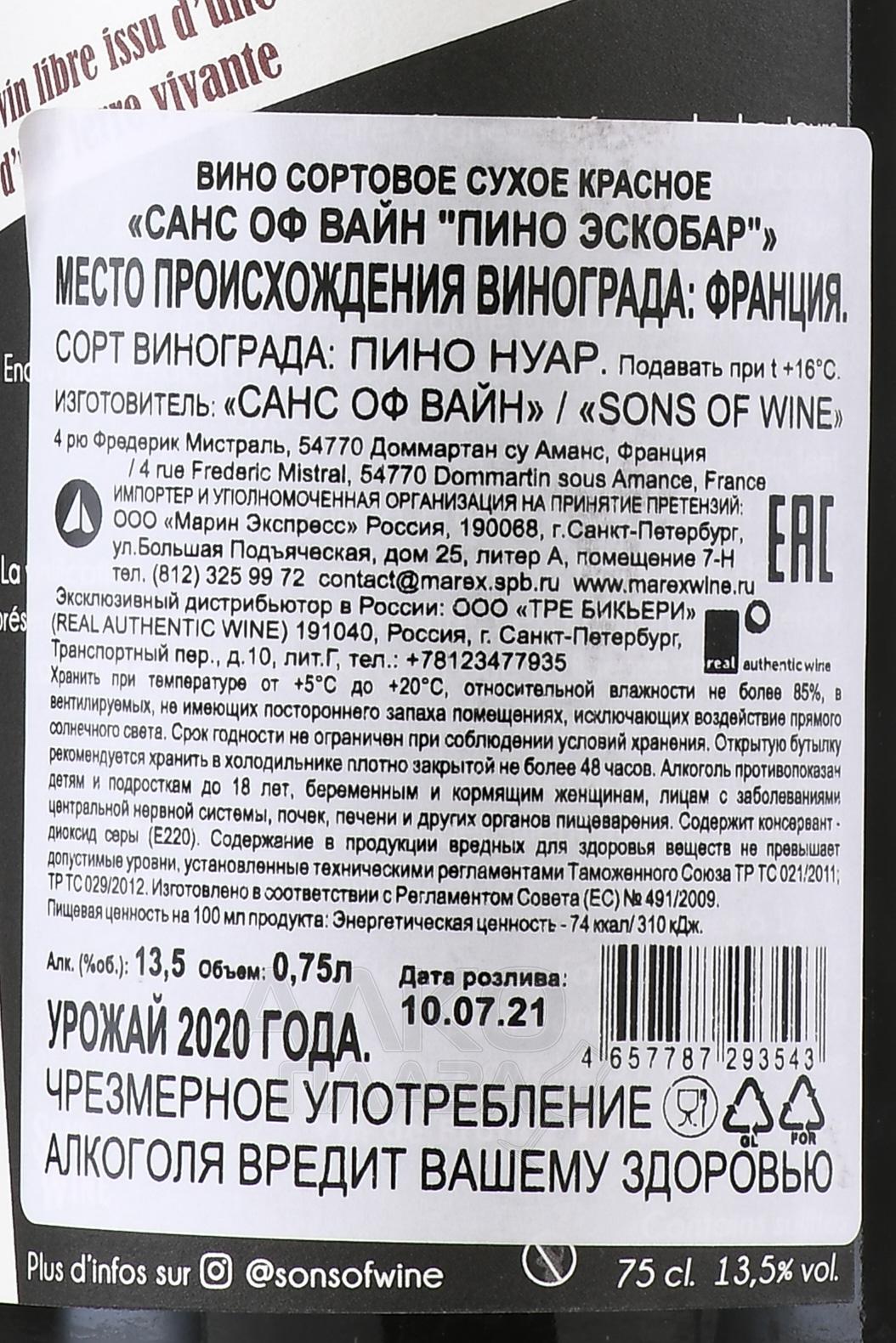 Sons of Wine Pinot Escobar - вино Санс оф Вайн Пино Эскобар 0.75 л красное сухое