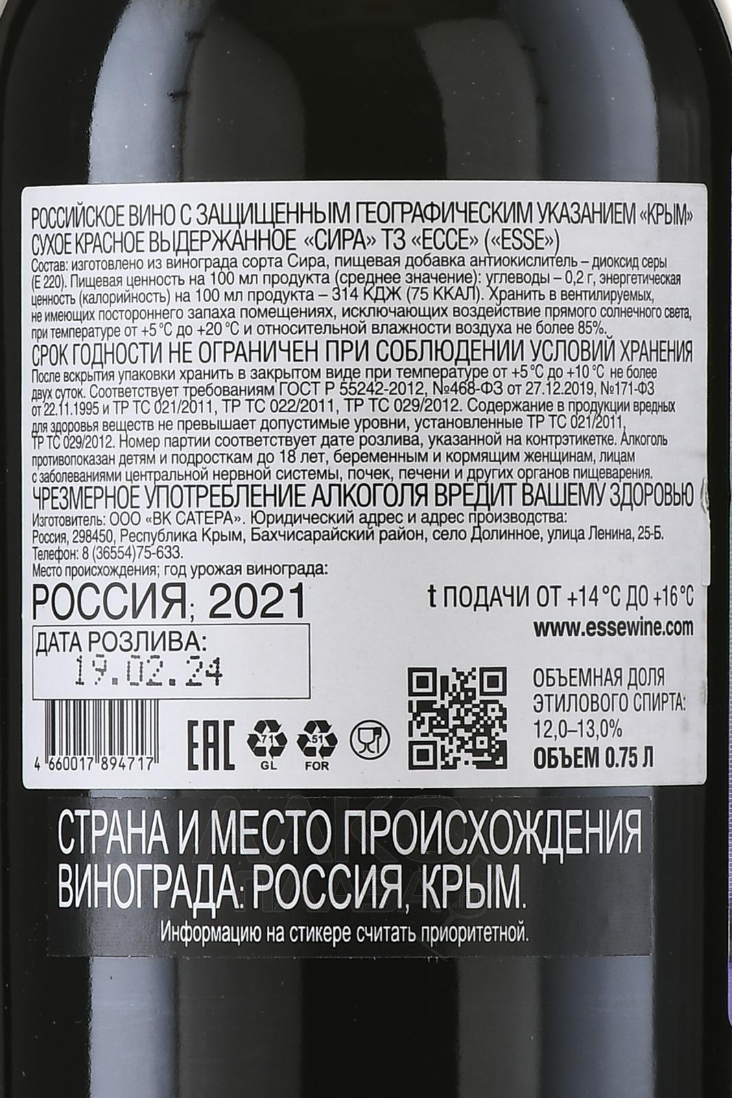 Вино Esse Syrah 0,75 л – моносортовой напиток красного сухого типа из винограда, выращенного в долине крымской реки Кача. Урожай созревает в окружении зарослей сосен, орешника, шиповника и скалистого дуба. Почвы на виноградниках – легкие и сухие суглинки с вкраплениями мела. В ясную погоду с участка просматривается морская даль. По мнению виноделов Бордо, утверждающих, что «лоза должна видеть воду», этот фактор немаловажен для выращивания хорошего урожая. Первая партия сортового вина Эссе Сира, изготовленная классическими методами, была выпущена в 2014 году.