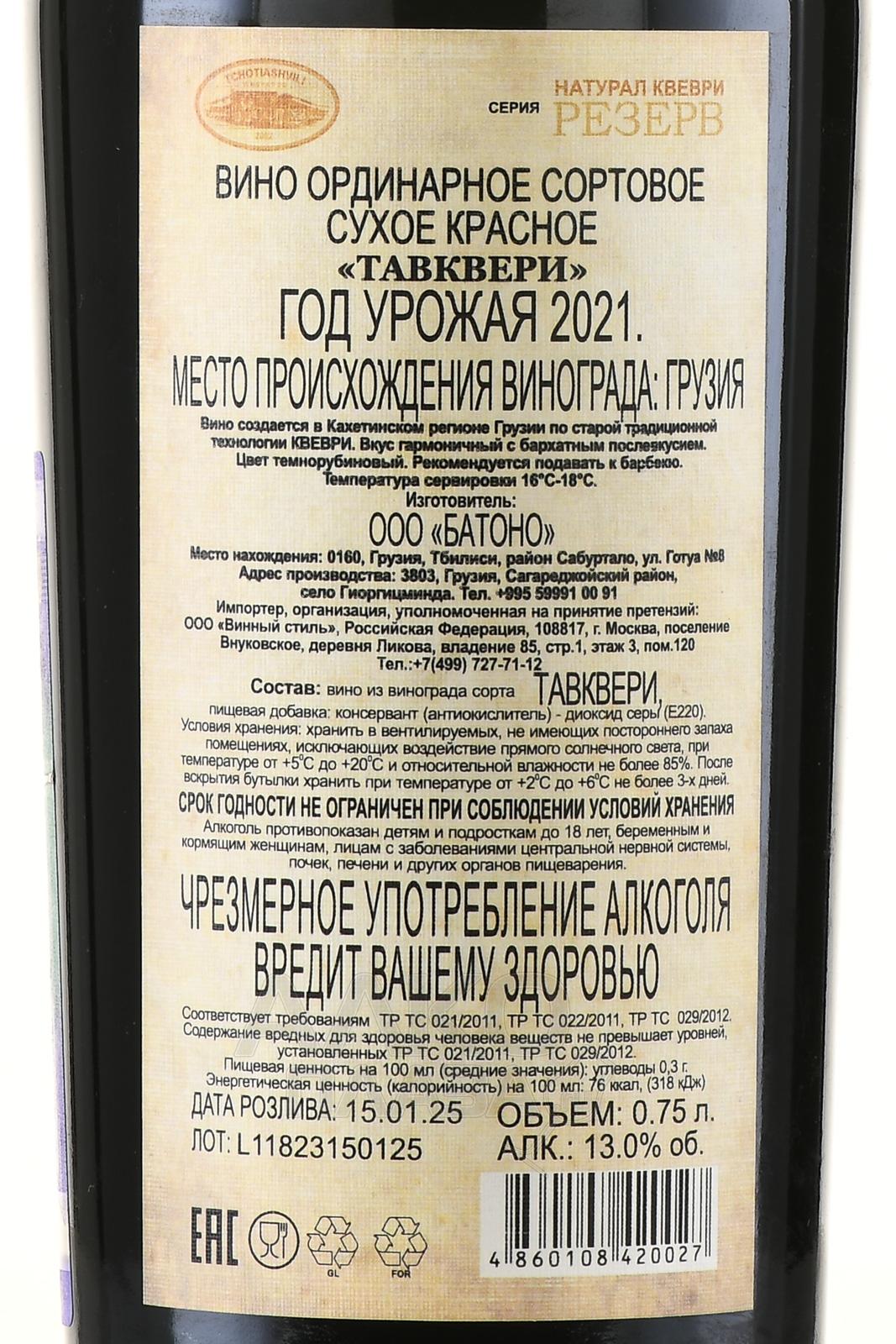Tchotiashvili Tavkveri Qvevri - вино Чотиашвили Тавквери Квеври 0.75 л красное сухое
