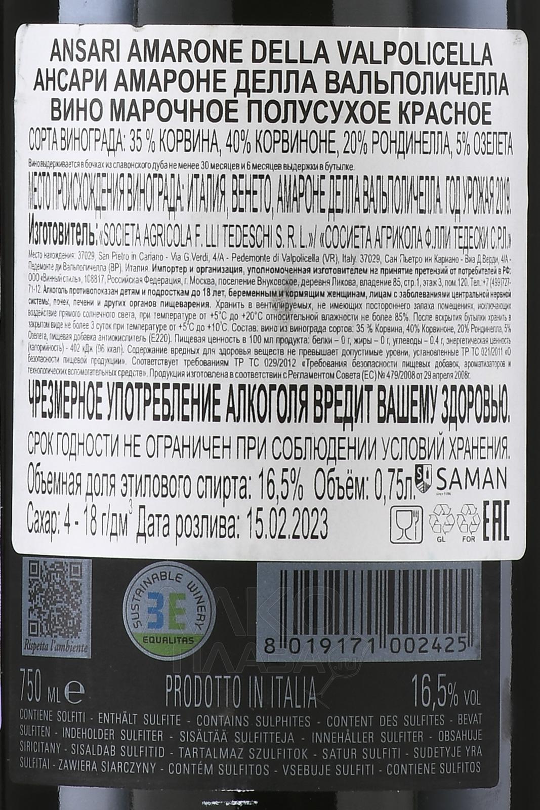 Красное полусухое вино Tedeschi Ansari Amarone della Valpolicella 0,75 л – это яркий пример традиционного итальянского мастерства из провинции Верона региона Венето. В основе производства – автохтонные сорта винограда Corvina, Corvinone, Oseleta и Rondinella, плоды которых выращены на территории зон Валполичелла Классико и Вальпантена. Эти места отличаются умеренно-континентальным климатом со средними летними температурами около +23,6 °C и годовым количеством осадков около 860 мм. Урожай собирают вручную в первой половине октября. Ягоды в течение 100–120 дней подсушивают методом аппассименто, во время которого теряется около 40–45% веса винограда, увеличивая концентрацию сахара и ароматических веществ. По завершении брожения напиток выдерживают три года в бочках из славонского дуба и затем не менее 6 месяцев – в бутылке.