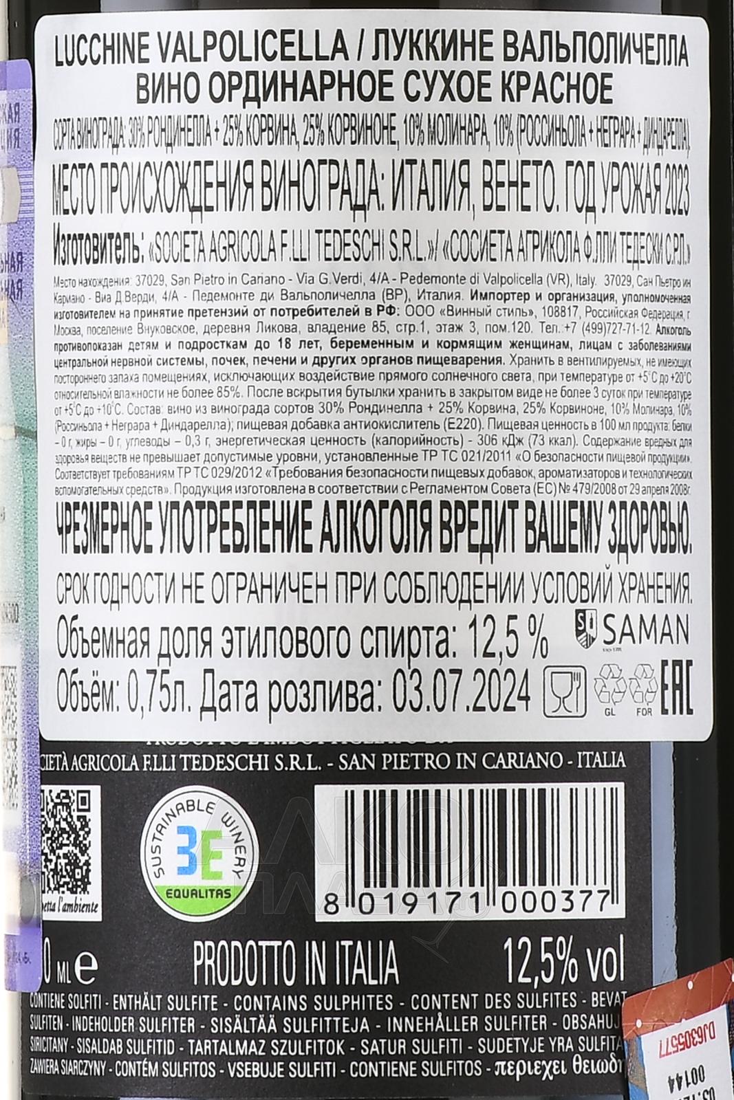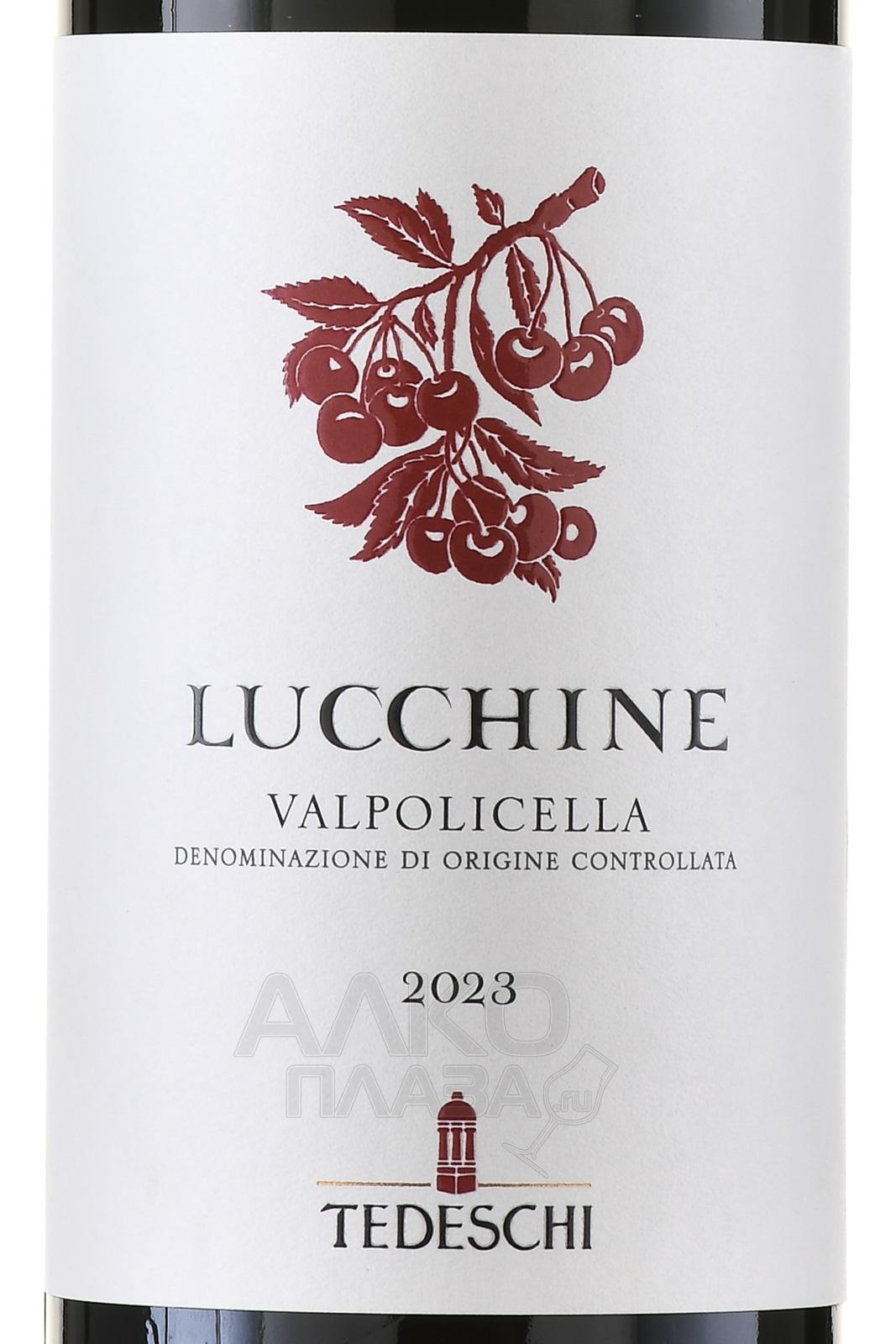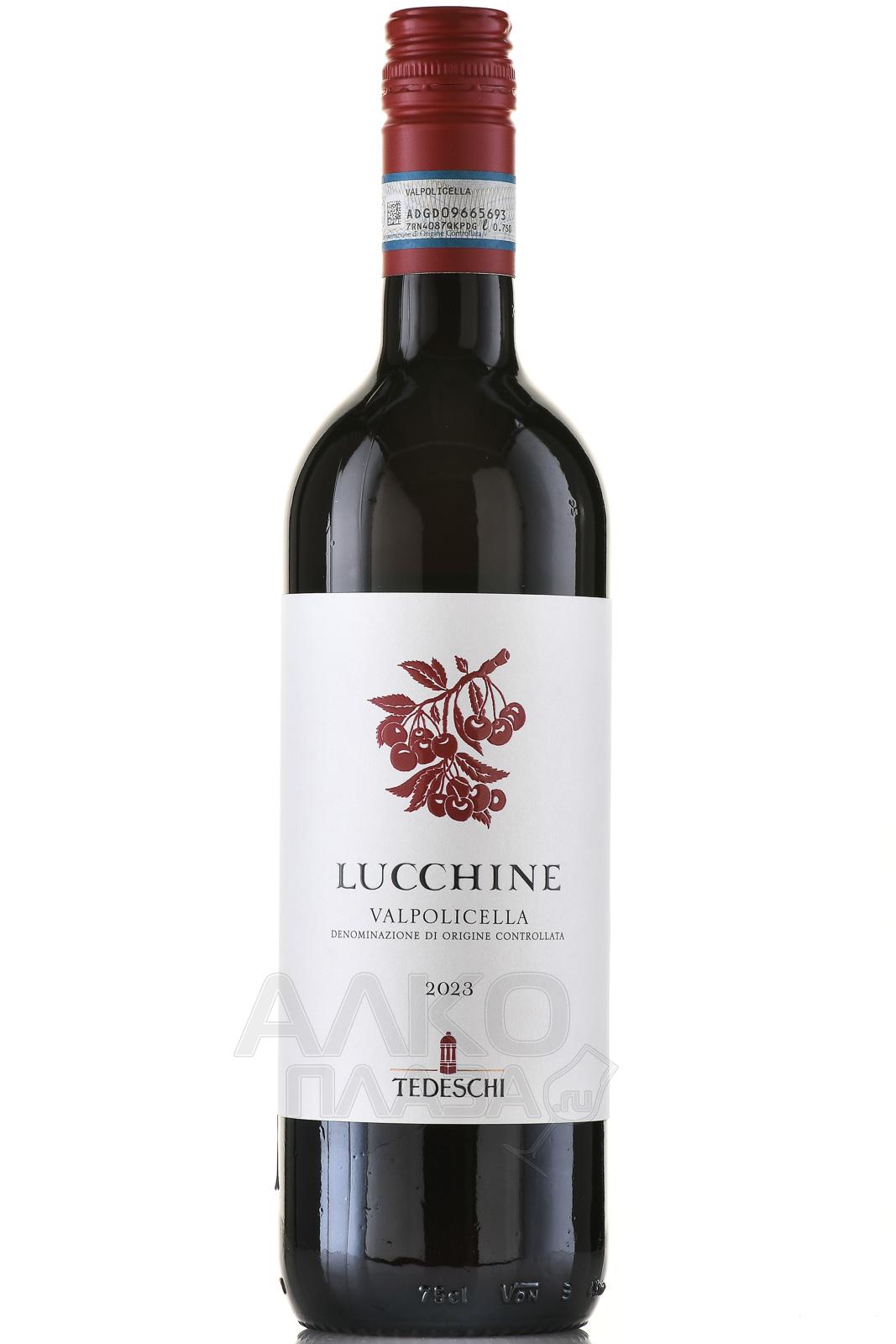 Красное сухое вино Tedeschi Lucchine Valpolicella 0,75 л — лёгкий свежий образец категории Valpolicella DOC, созданное известным итальянским хозяйством. Урожай винограда для винификации собирается вручную в начале октября в классической зоне Валполичелла. Терруар характеризуется аллювиальными почвами с известковыми и глинистыми компонентами. Средний возраст лоз составляет 25 лет, плотность посадок — около 4000 кустов на гектар, формировка растений — традиционная пергола. После сбора ягоды отделяют от гребней и ферментируют при температуре 28 °С в течение примерно 8 дней. Затем проводят малолактическую ферментацию и выдержку в резервуарах из нержавеющей стали с дополнительной стабилизацией в бутылках не менее двух месяцев.