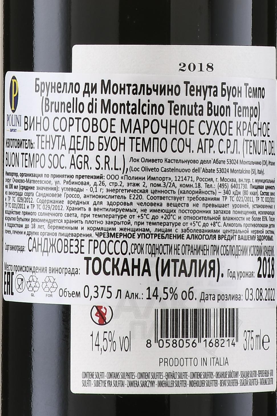 Красное сухое вино Tenuta Buon Tempo Brunello di Montalcino 0,75 л создано из винограда сорта Санджовезе, выращенного в южной части Монтальчино, где солнечные склоны и каменистые почвы создают идеальные условия для формирования насыщенного и сбалансированного вина. Сбор сырья проводился вручную (только с лоз с очень низкой урожайностью — не более килограмма с растения). Ферментация проходила естественным образом, с использованием диких дрожжей и длительной мацерацией (до 28 дней) в стальных емкостях. Далее последовала многоступенчатая выдержка: два года в дубовых тонно, еще до двух лет в больших бочках из славонского дуба, полгода в стали и шесть месяцев в бутылке. Такой подход обеспечил вину структуру и глубину. Брунелло ди Монтальчино от Тенута Буон Темпо часто отмечается экспертами за чистоту стиля и гармоничное сочетание силы и элегантности.