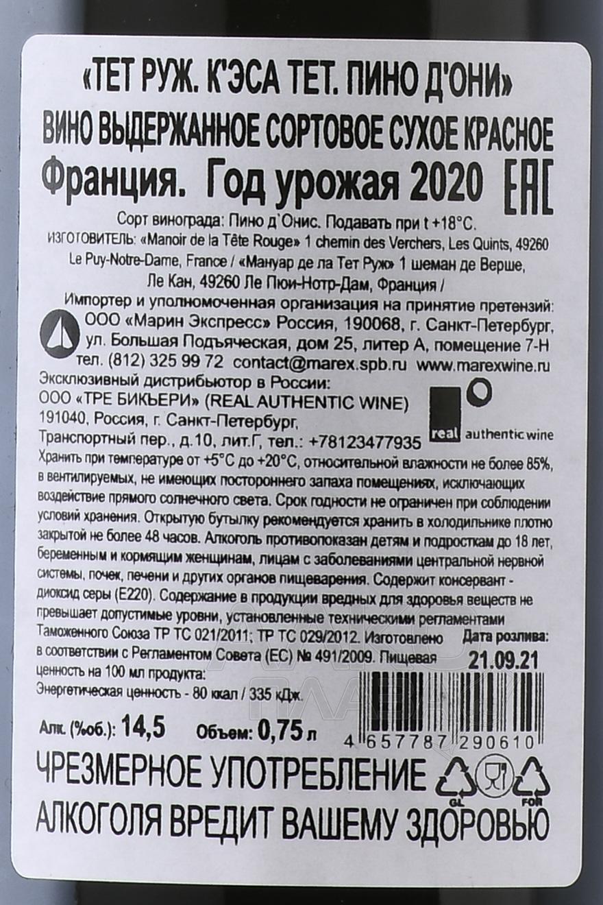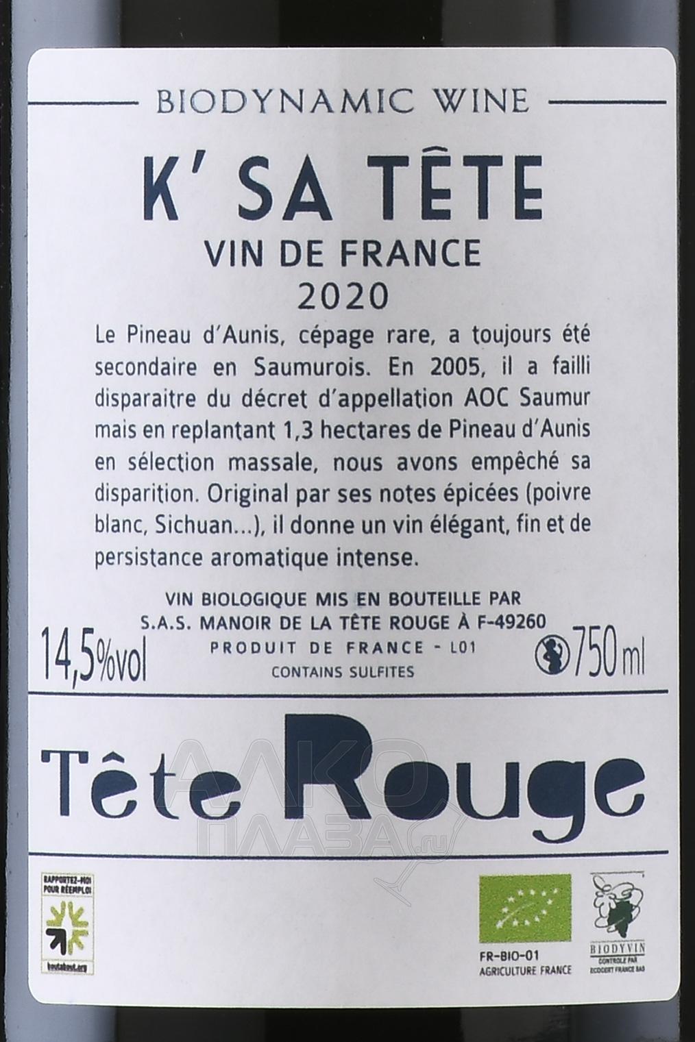 Красное сухое вино Tete Rouge K`Sa Tete Pineau d`Aunis 0,75 л — биодинамическое, создано из редкого сорта Пино д`Онис. Виноград выращивается в Самюре на глинисто-известняковых и меловых почвах, что формирует особую свежесть и минеральность вкуса. Возраст лоз достигает 20 лет. Урожай собирали вручную, строго в момент оптимальной спелости. После отделения гребней ягоды проходили двухнедельную мацерацию в бетонных резервуарах, а затем естественную ферментацию с дикими дрожжами. Напиток выдерживался полгода в дубе и бутилировался в мае следующего за урожаем года. Такой метод сохраняет чистый стиль и передает характер терруара Луары. Вино отмечено критиками за гармоничное сочетание традиции и современного подхода.