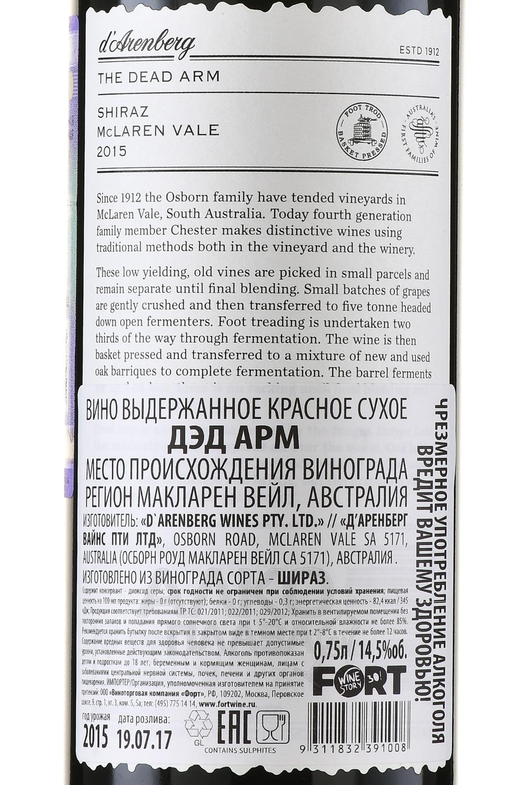 Красное сухое вино The Dead Arm d`Arenberg 0,75 л создано в регионе Макларен Вейл, Австралия, известном своим тёплым климатом и глинисто-известковыми почвами. Виноград здесь получает много солнца, но сохраняет баланс благодаря прохладным морским ветрам. Сырье собирают вручную с малоурожайных лоз. Часть завязи естественным образом усыхает, из-за чего оставшиеся грозди в большей степени наливаются соком и накапливают ароматические вещества. Ферментация осуществляется в рамках традиционного метода с погружением шапки, затем вино выдерживается в дубовых бочках, часть из которых новые. Оно получило высокие оценки критиков и регулярно входит в престижные национальные рейтинги, подтверждая статус культового австралийского Шираза.
