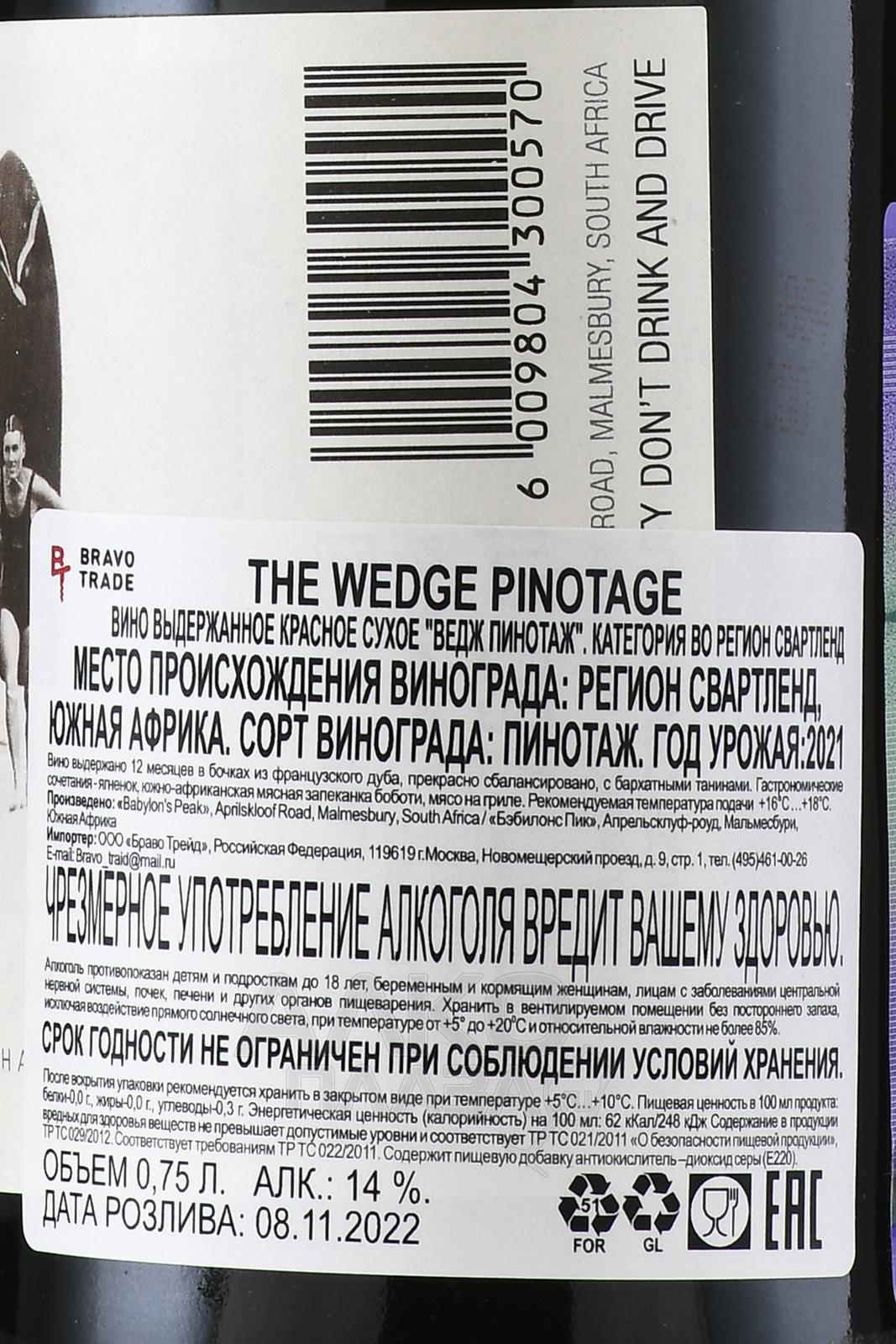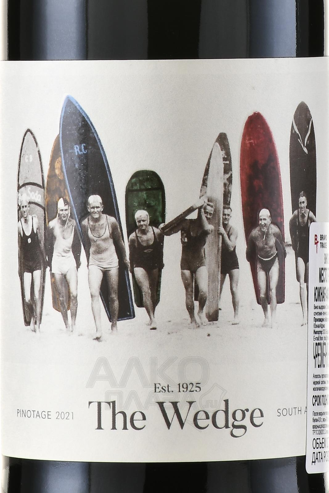 Красное сухое вино The Wedge Pinotage 0,75 л является моносепажным, ведь в составе представлен виноград одной вариации с угодий выгодной юго-восточной экспозиции. Местность происхождения урожая — региона Свартленд в Южно-Африканской Республике. Вино медленно сбраживалось в металлических баках с регулировкой диапазона температур. Его яркий, запоминающийся букет оформился после годичной выдержки во французском дубе.