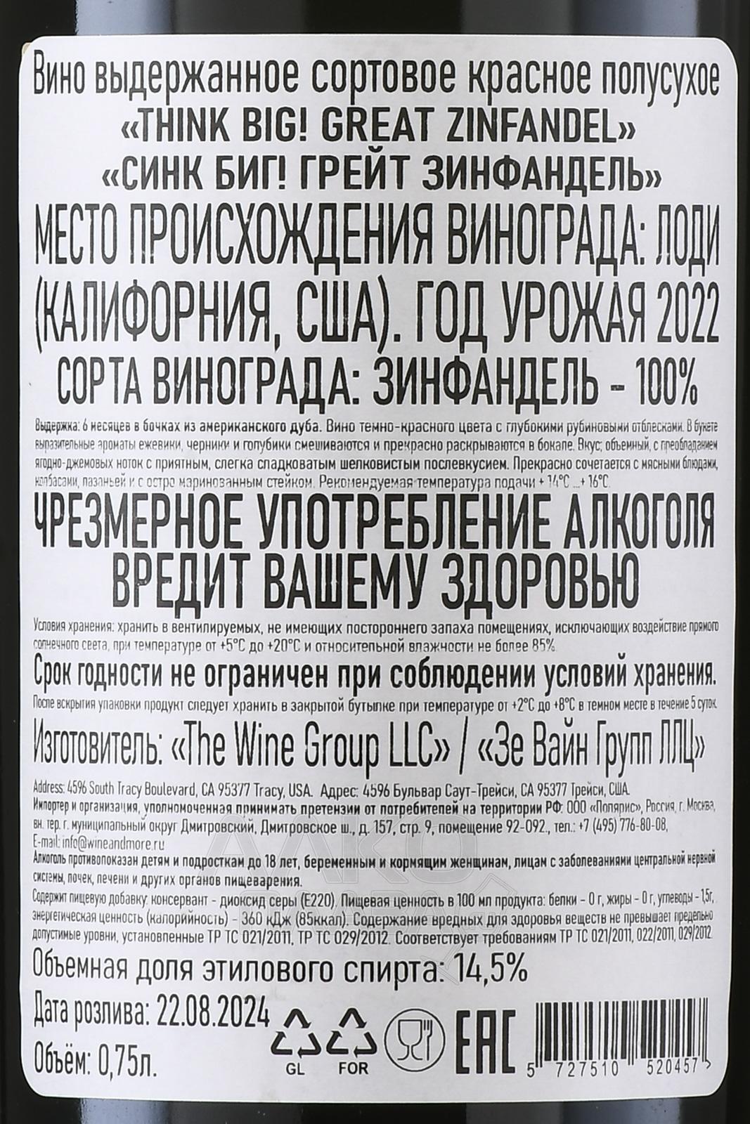 Красное полусухое вино Think Big! Great Zinfandel 0,75 л производится исключительно из винограда популярного американского сорта Zinfandel, выращенного в винодельческом регионе Лоди в Калифорнии. Терруар региона характеризуется плодородными песчано-глинистыми почвами и засушливым климатом с жаркими днями и прохладными ночами. Такие условия способствуют постепенному созреванию винограда, позволяя ему набрать оптимальный уровень сахара и кислотности. В процессе производства напиток выдерживался в дубовых бочках американского и французского происхождения, благодаря чему приобрел приятные пряные мотивы и округлый вкус с мягкими танинами.