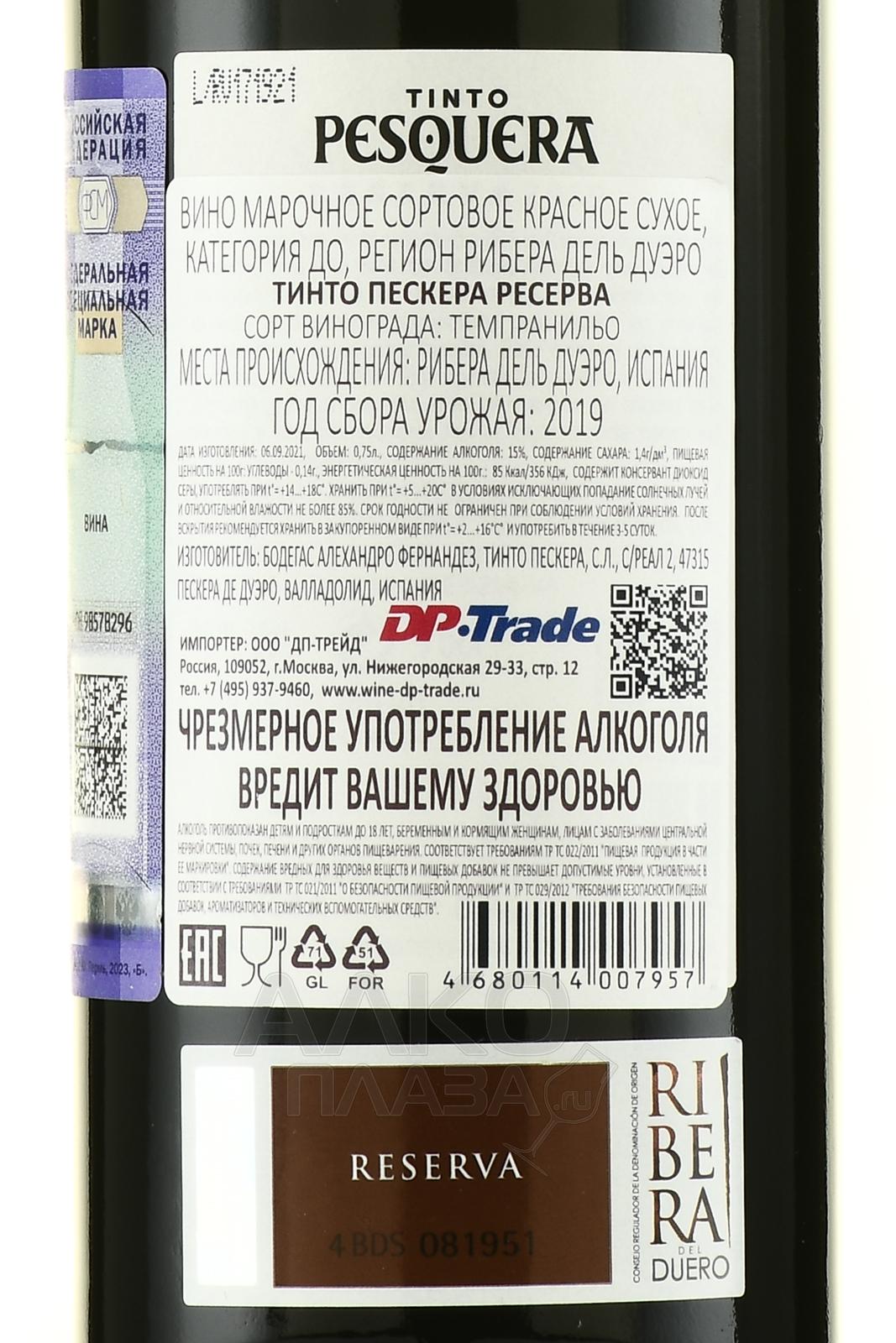 Красное сухое вино Tinto Pesquera Reserva Ribera del Duero 2019 г. 0,75 л – моносепажная вариация с собственных виноградников испанской компании. Урожаи собрали с лоз, высаженных в провинции Вальядолид вдоль реки Дуэро на высоте 700-750 метров над уровнем моря на бедных, хорошо дренированных почвах из песка и гравия с известняково-глинистой подпочвой. Плантации естественным образом орошаются водой из близлежащей реки. Местный терруар характеризуется жарким летом, очень холодной зимой и экстремальными суточными перепадами температур, которые создают все предпосылки для получения роскошных шелковистых напитков из флагманского автохтона. После термоконтролируемого брожения спиртное долгое время созревало в американских дубовых бочках и дополнительно – в бутылках, приобретая элегантный и глубокий органолептический профиль.