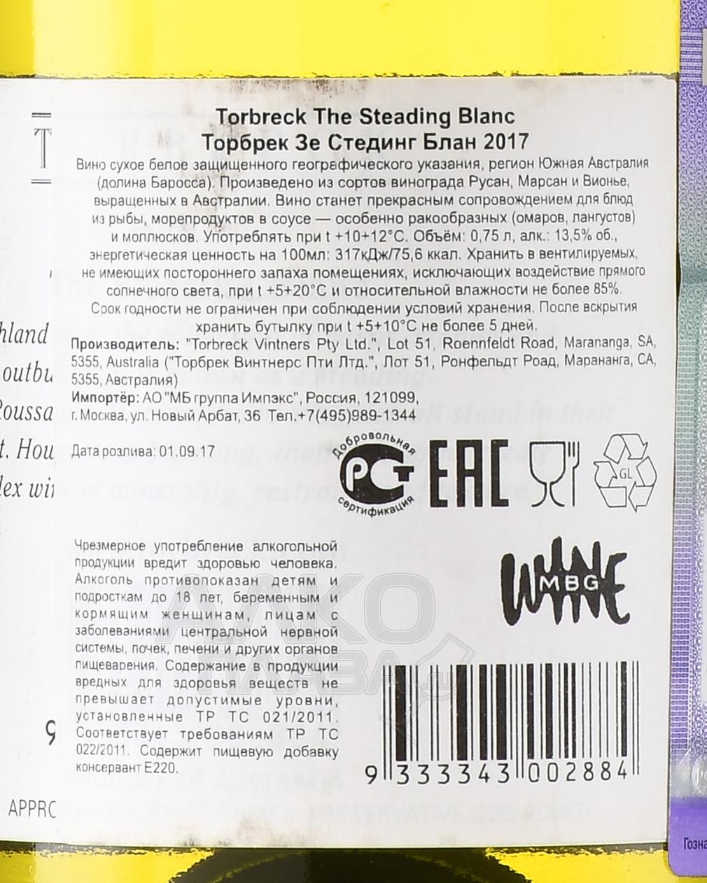 Белое сухое вино Torbreck The Steading Blanc 0,75 л представляет собой нетипичный для Австралии купаж, являющийся популярным во французском регионе Долина Роны. Несмотря на редкое присутствие на мировом рынке, ронские лозы отлично показали себя в Южной Австралии, что подтверждает напиток из региона Баросса. Виноград частично ферментировался в стали, частично – в дубе. Выдержка проходила на тонком осадке во французских барриках.