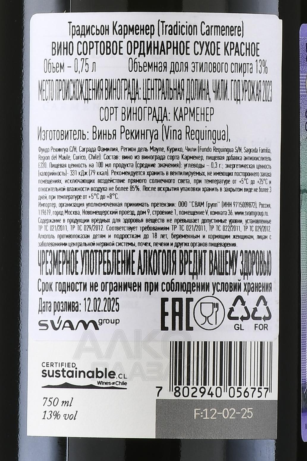Вино Винья Рекуингуа Традисьон Карменер 0.75 л красное сухое создано в сердце Чили, где идеальные климатические условия и богатые минеральные почвы долины Центрального региона придают напитку глубину и характер. Напиток производят из урожая с лоз, выращенных на солнечных склонах Анд, где перепад температур между днём и ночью помогает ягодам сохранять баланс сахаров и кислот. Производство проходит по классической технологии с бережным сбором урожая вручную и последующей мацерацией на кожице для насыщенного цвета и выразительного букета. Ферментация проводится при контролируемой температуре в нержавеющих резервуарах, а выдержка частично проходит в дубовых бочках, что придаёт вкусу округлость и мягкие пряные ноты. Это воплощение чилийского мастерства и уважения к традициям виноделия.