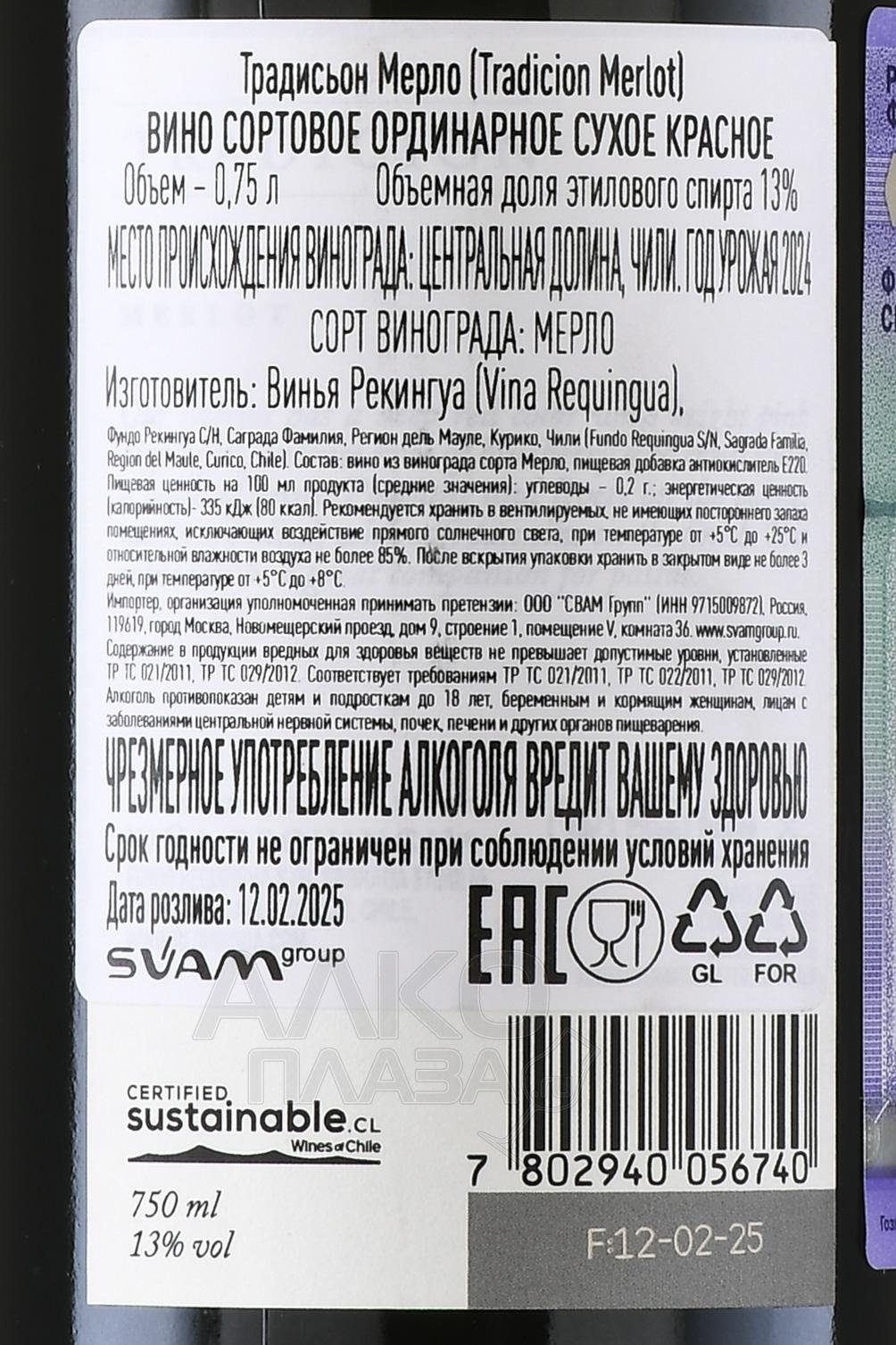 Вино Винья Рекуингуа Традисьон Мерло 0.75 л красное сухое — воплощение чилийского винодельческого мастерства и выразительного южного характера. Этот напиток рождается на виноградниках Центральной долины, где перепады дневных и ночных температур придают ягодам насыщенность вкуса и утонченность аромата. Урожай собирают вручную, а ферментация проходит в стальных резервуарах при контролируемой температуре, что позволяет сохранить свежесть и естественную фруктовость сорта. После брожения напиток выдерживается в дубовых бочках, благодаря чему обретает бархатистую структуру и мягкие таннины. Терруар региона с богатой минералами почвой и мягким климатом Тихоокеанского побережья делает вкус гармоничным и сбалансированным, отражая природное богатство Чили.