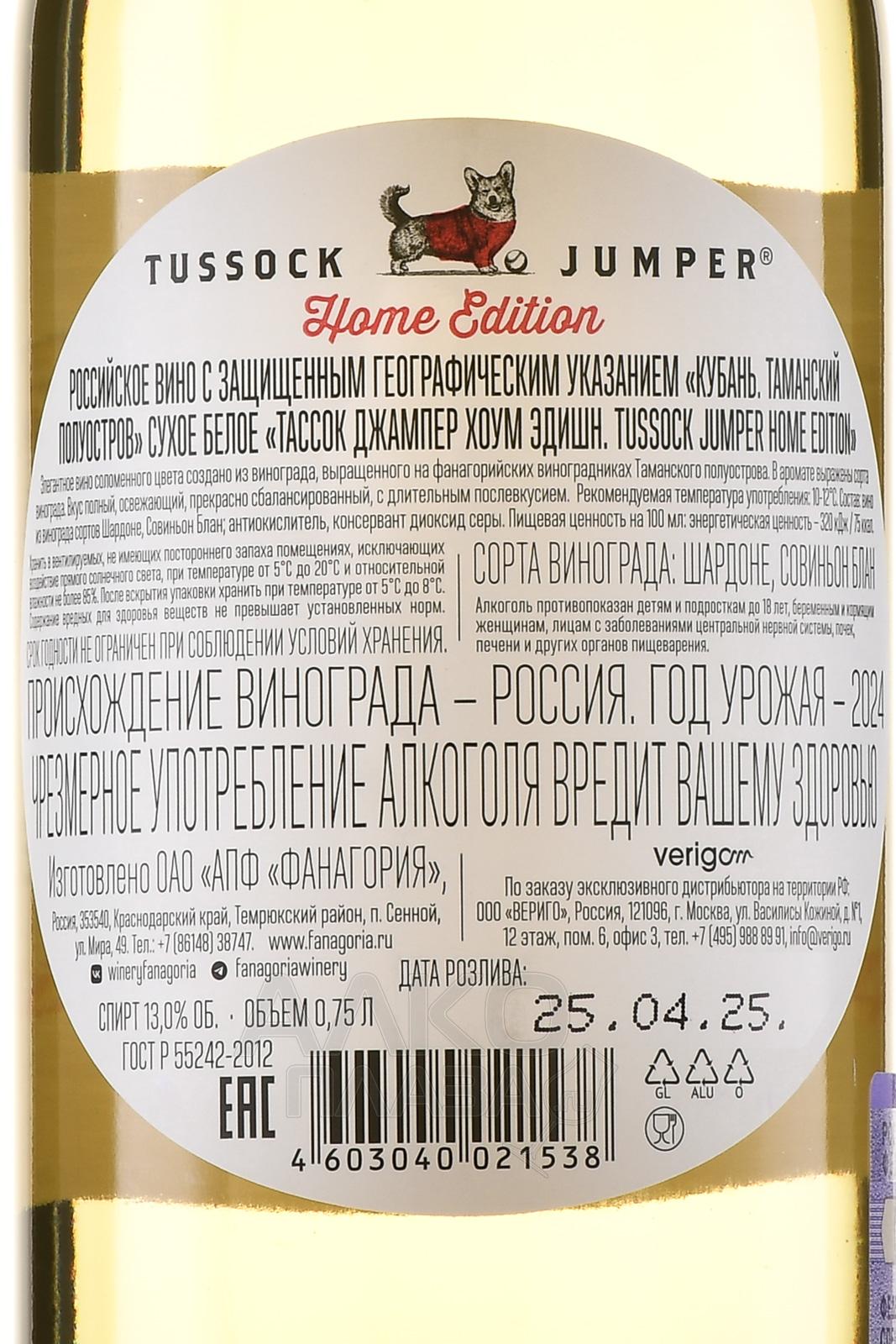 Белое сухое вино Tussock Jumper Home Edition 0,75 л производится в России и имеет защищенное географическое указание «Кубань. Таманский полуостров». Для его создания используется виноград, выращенный на фанагорийских виноградниках, которые расположены в уникальном терруаре между Черным морем и Азовским морем. Мягкий климат с теплым летом, прохладными ночами и достаточным количеством солнечных дней формирует гармоничное сочетание сахаров и кислот в ягодах. Купаж производится методом холодной ферментации в стальных емкостях, что сохраняет натуральную свежесть и яркость вкуса.