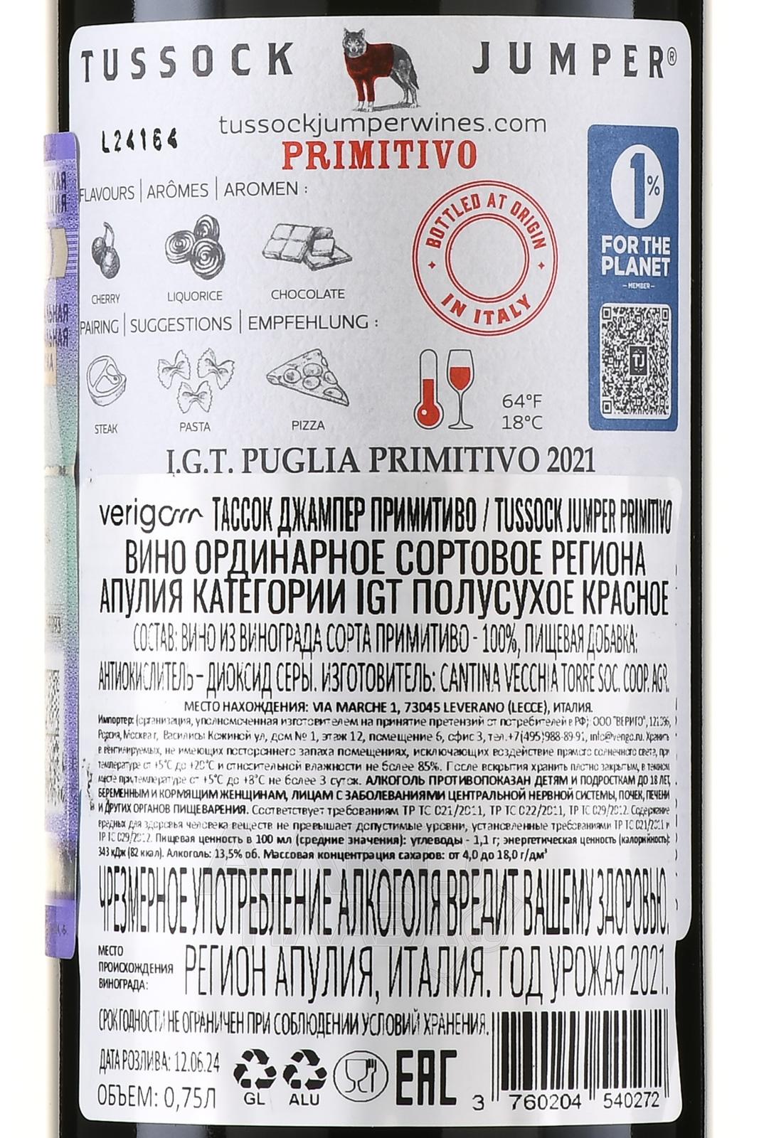 Красное полусухое вино Tussock Jumper Primitivo 0,75 л производится в южной Италии, в регионе Апулия, где сорт Примитиво чувствует себя особенно уверенно благодаря теплому средиземноморскому климату и известково-глинистым почвам. Лозы здесь растут на высоте около 200 метров над уровнем моря, в зонах с высокой инсоляцией и редкими осадками, что способствует концентрации сахаров и аромата в ягодах. Урожай собирают вручную, тщательно отбирая спелые грозди. Ферментация проходит при контролируемой температуре, а небольшая выдержка в дубе придает напитку мягкость и округлость.