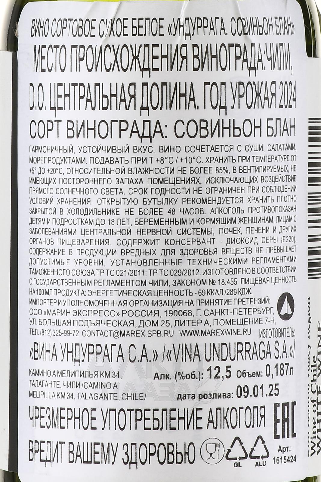 Ундуррага Совиньон Блан 0.187 л белое сухое создаётся из отборных ягод, выращенных на виноградниках Центральной Долины, расположенной в Чили. Холодный климат, близость Тихого океана и минеральные почвы дарят напитку свежесть и выразительность. Урожай собирается вручную ранним утром для сохранения естественной кислотности ягод. Винификация проходит в стальных резервуарах при контролируемых низких температурах, благодаря чему напиток приобретает чистоту вкуса и изящные, утончённые ароматы.