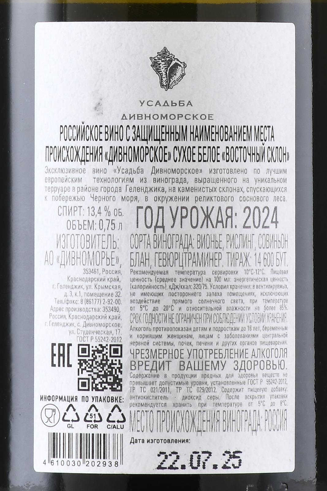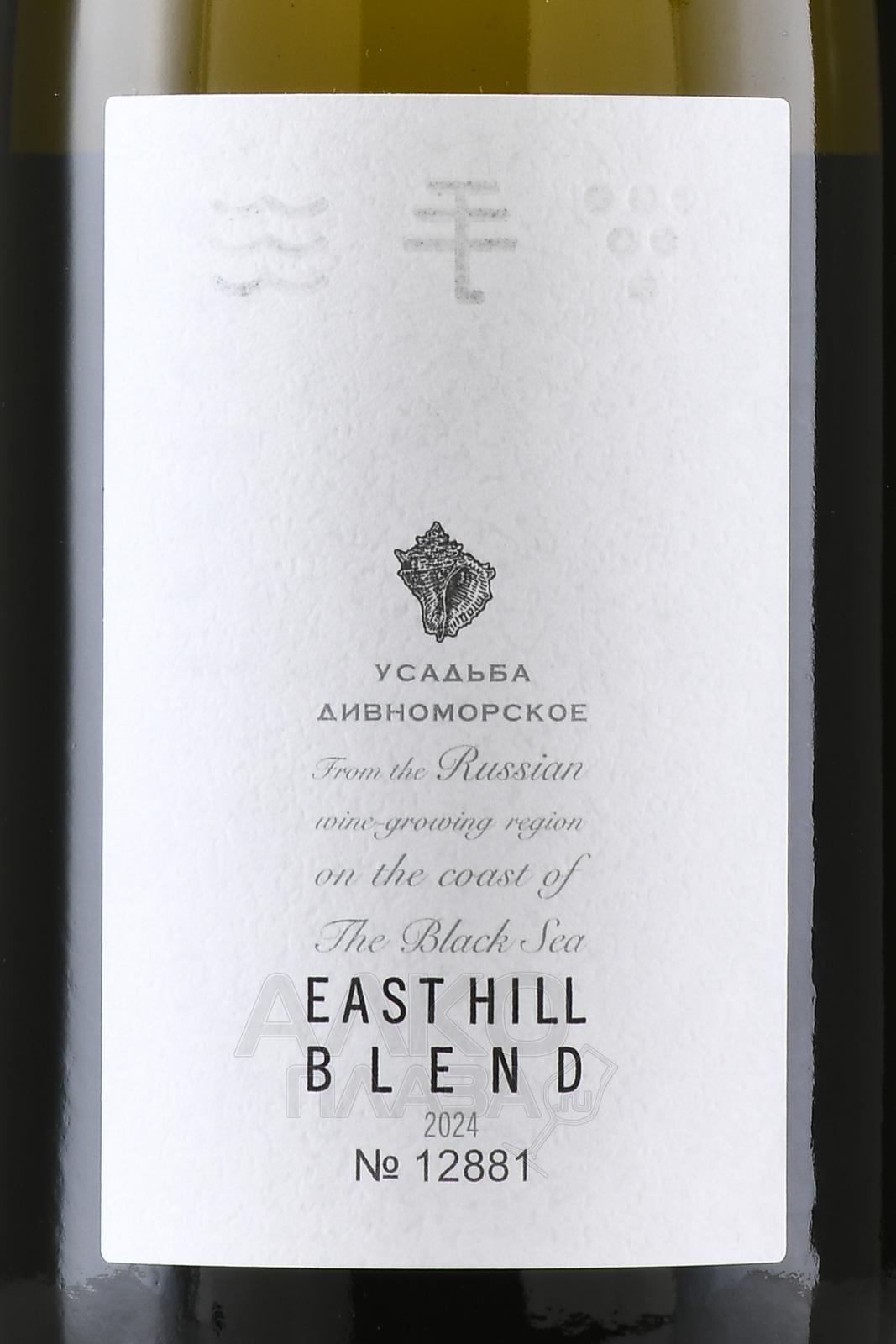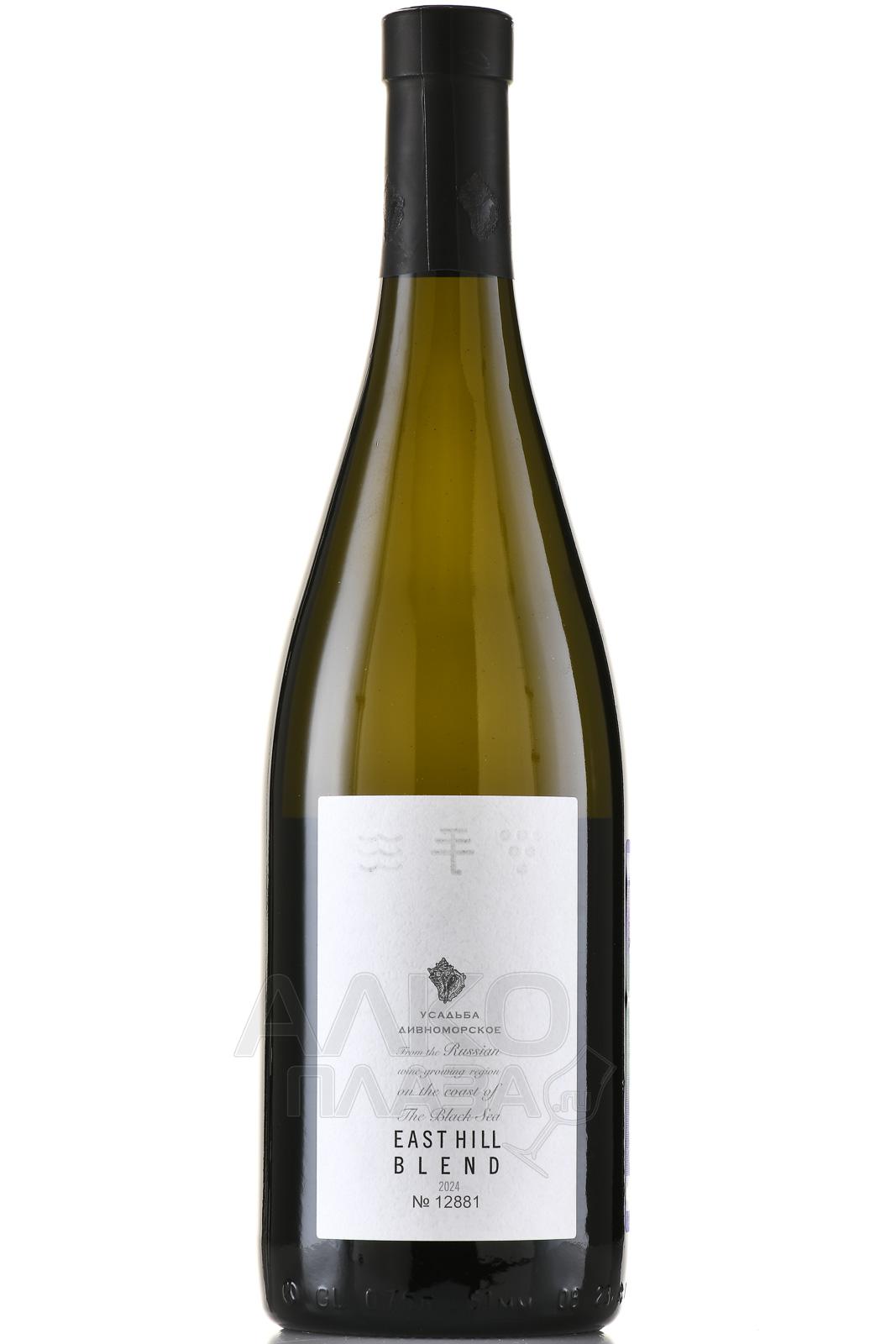 Белое сухое вино Усадьба Дивноморское East Hill Blend 0,75 л создаётся на побережье Чёрного моря. Виноградные лозы растут на каменистых холмах среди реликтовых сосен, что подчёркнуто изображением ракушки рапана на этикетке. Урожай собирают вручную после того, как ягоды достигают наилучшей зрелости. Каждый из четырёх сортов (Вионье, Гевюрцтраминер, Совиньон Блан, Рислинг) ферментируют отдельно, этот процесс длится около двух недель. Затем напиток выдерживают в ёмкостях из нержавеющей стали на тонком осадке. Финальный этап — купажирование и дополнительное созревание вина в бутылках около шести месяцев.