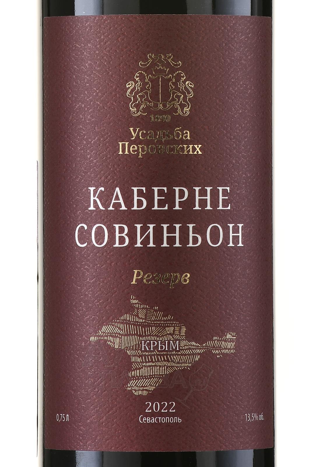 Вино Усадьба Перовских Кабарне Совиньон резерв — вино прошедшее ферментацию и выдержку, в течение 18 месяцев, в бочках из американского дуба. Цвет насыщенный, пурпурный. Аромат вина интенсивный, яркий, с прекрасно гармонирующими нотками черносмородинового джема, ежевики, ванили и чёрного перца. Вкус демонстрирует мощную структуру, красивые зрелые танины и яркие джемовые оттенки. С вином будут прекрасно сочетаться стейки, блюда из дичи, твёрдые сыры.