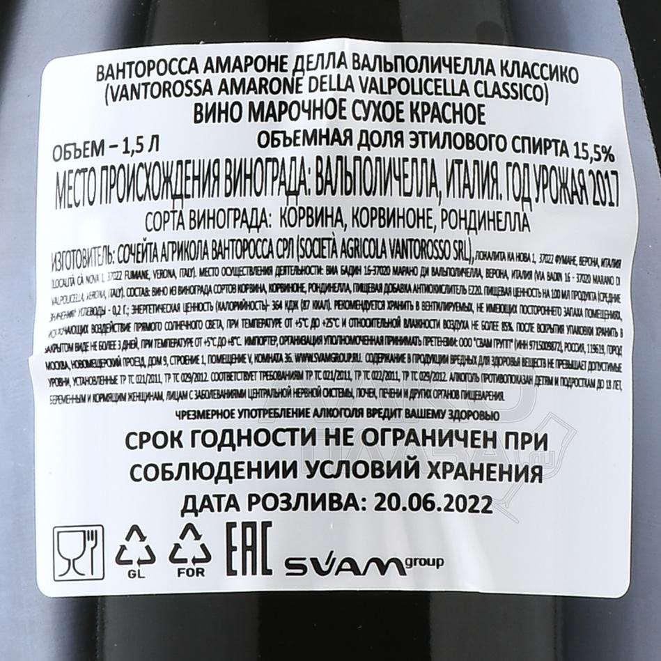 Красное сухое вино Vantorosso Amarone Della Valpolicella Classico 1,5 л в п/у производится в исторической зоне на севере Италии. Виноградники расположены на холмах предальпийской зоны, где преобладают известковые и известково-глинистые почвы с хорошей водопроницаемостью. Умеренно континентальный климат с влиянием озера Гарда обеспечивает тёплое лето и прохладные ночи, что способствует сохранению кислотности и формированию сложного фенольного профиля. Эти условия придают напитку плотность, глубину и выраженную структуру. Производство основано на традиционной технологии appassimento. После ручного сбора ягоды подвяливают в проветриваемых помещениях, добиваясь концентрации сахаров и экстрактивных веществ. Ферментация проходит медленно. Далее следует выдержка, направленная на смягчение танинов и развитие вторичных ароматов. Вино несколько лет созревает в дубе, а потом — в бутылках. Солидный формат и сувенирный бокс подчёркивают высокий статус купажа.