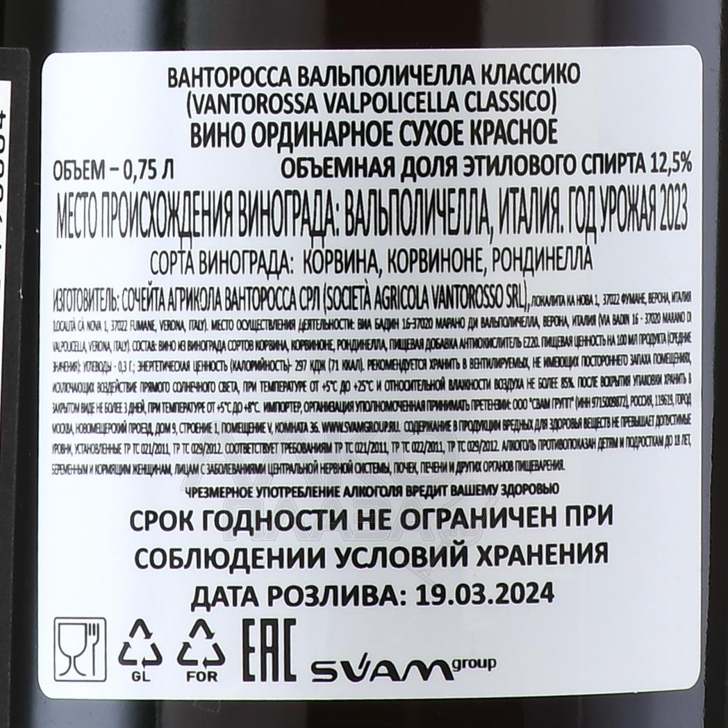 Красное сухое вино Vantorosso Valpolicella Classico 0,75 л производится на севере Италии, в регионе Венето, в исторической зоне апелласьона категории DOC. Виноградники расположены на юго-восточных склонах холмов к северу от Вероны, на высотах 350–400 метров над уровнем моря, от равнин до предгорий Альп. Плотность посадки — 5000 лоз/га. Почвы — преимущественно известняково-глинистые, меловые, каменистые, с хорошим дренажем. Они способствуют формированию купажей с умеренной плотностью и свежим фруктовым профилем. Климат — мягкий, с заметным влиянием озера Гарда, которое сглаживает температурные колебания и продлевает период созревания винограда. Напиток производится по классической для наименования технологии без использования метода аппассименто. Ферментация проходит при контролируемой температуре 25–30 °C в течение десяти дней в резервуарах из нержавеющей стали. Выдержка осуществляется в стальных контейнерах до февраля, а до реализации бленд дозревает в бутылках на протяжении трёх месяцев.