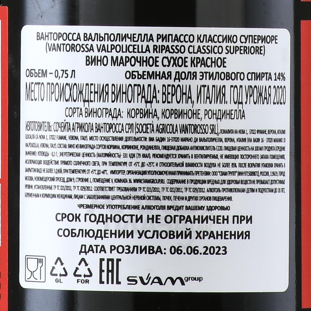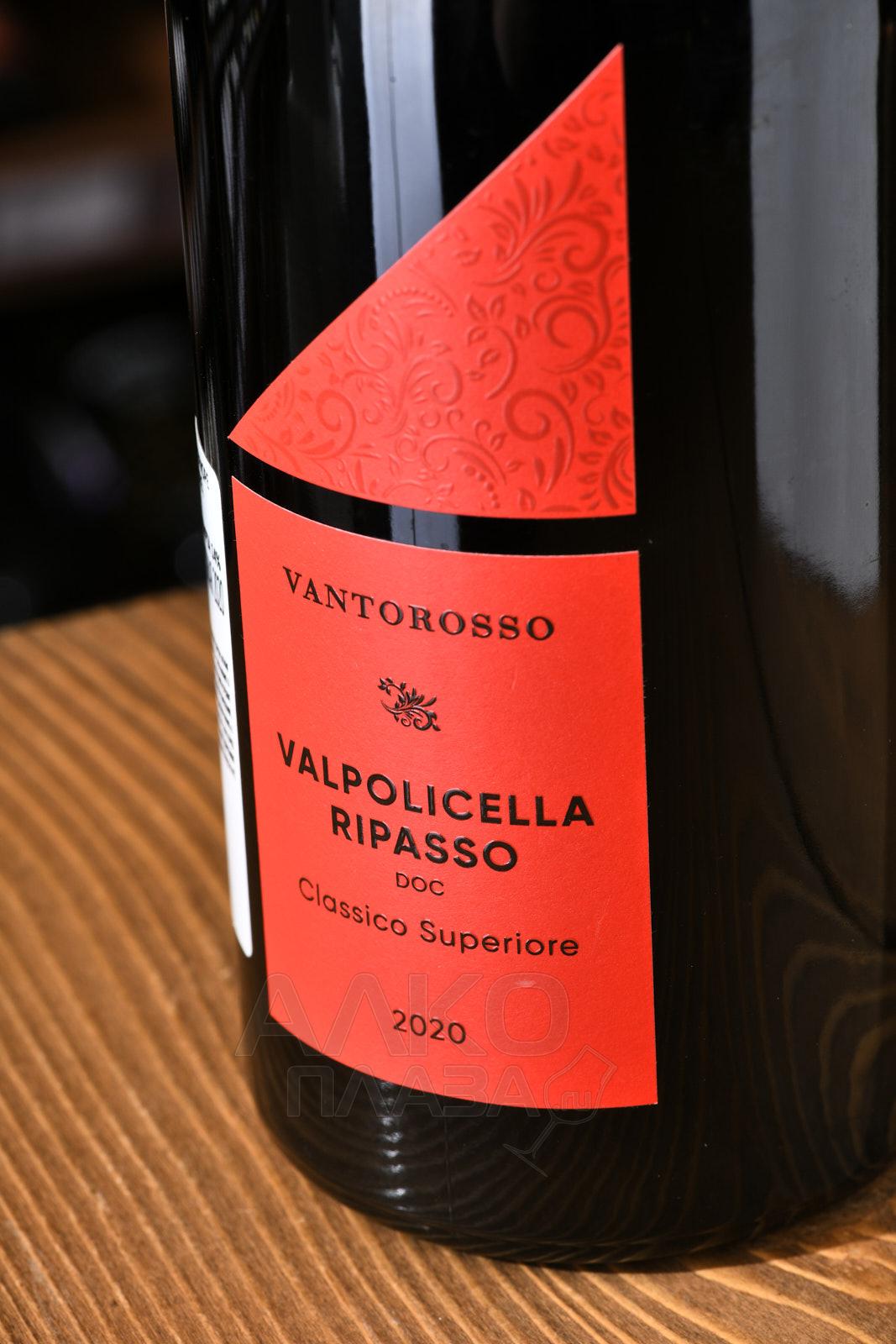 Красное сухое вино Vantorosso Valpolicella Ripasso Classico Superiore 0,75 л производится в коммуне Фумане, в провинции Верона, на холмах исторической зоны Вальполичелла Классико. Виноградники расположены на высоте 350–400 метров над уровнем моря и ориентированы на юго-восток, что обеспечивает равномерное солнечное освещение в течение дня. Почвы здесь разнородные, преимущественно глинистые и известковые, с высоким содержанием камней и скальных включений. Такой состав ограничивает силу роста лоз и способствует концентрации веществ в ягодах. Климат — умеренный, с выраженными суточными перепадами температур, что положительно влияет на ароматическую выразительность и кислотный баланс. Лозы выращиваются по системе Гюйо при плотности около 5000 растений на гектар. Сбор урожая проводится вручную в последние десять дней сентября. Первая ферментация проходит в стальных ёмкостях при контролируемой температуре. Затем проводится второе брожение на кожице от производства Амароне, насыщенной сахарами, цветом и ароматическими соединениями. Выдержка осуществляется во французских дубовых барриках из скального дуба в течение 15 месяцев, после чего следует бутылочное созревание продолжительностью около 7 месяцев.