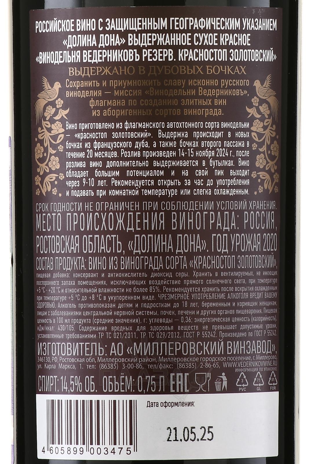 Моносепажное вино из Донского автохтонного сорта красностоп золотовский. Урожай собирают с виноградников с ограниченной урожайностью, вручную в маленькие ящики для сохранности целостности ягод. Площадь виноградников Красностопа Золотовского 12 гекторов.Гребни отделяются гребнеотделителем. Выдерживается вино в французских бочках в течение 15-16 месяцев.