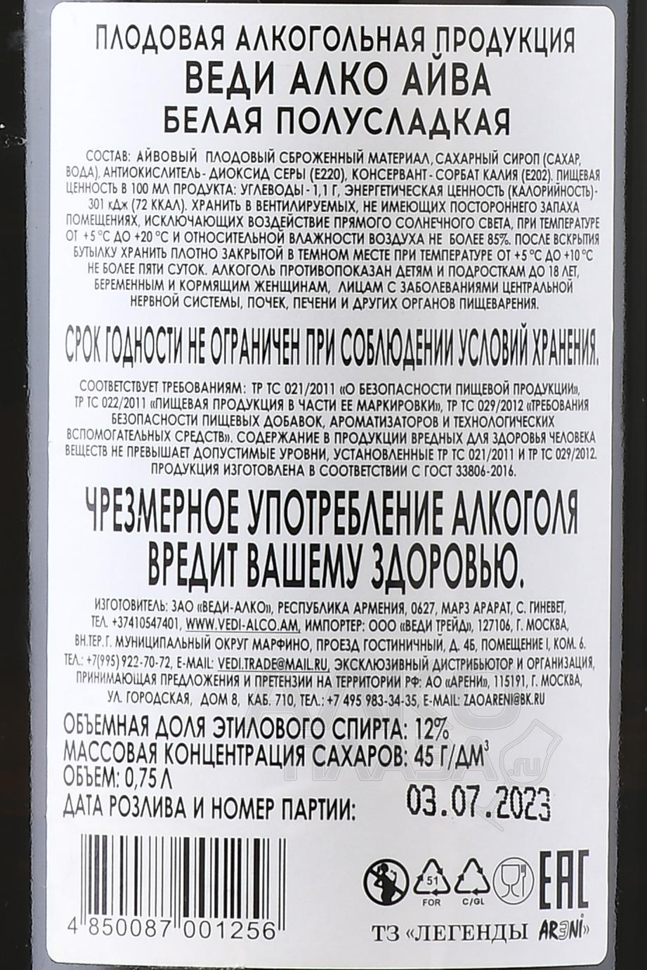 Vedi Alco Quince - вино Веди Алко Айва 0.75 л белое полусладкое