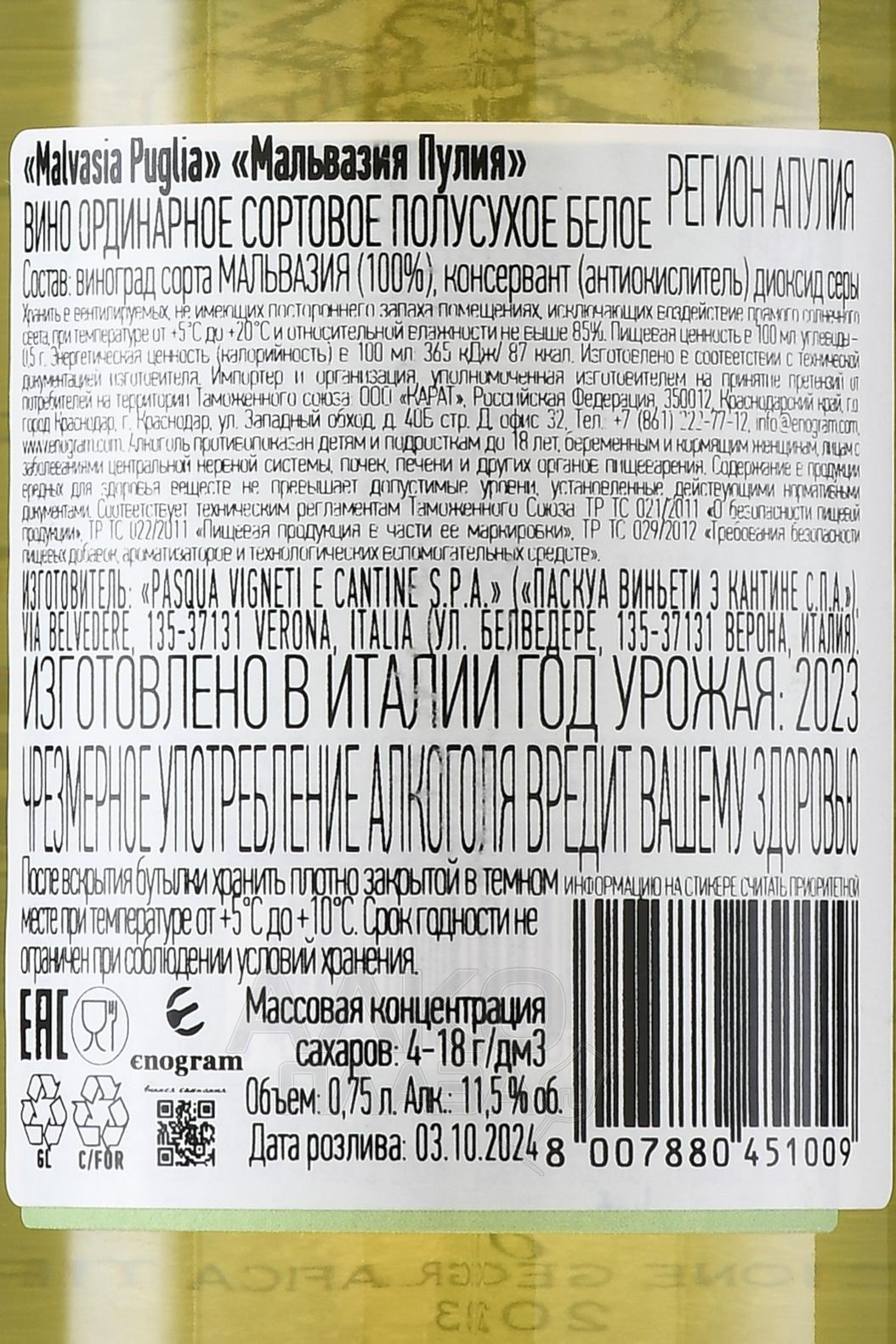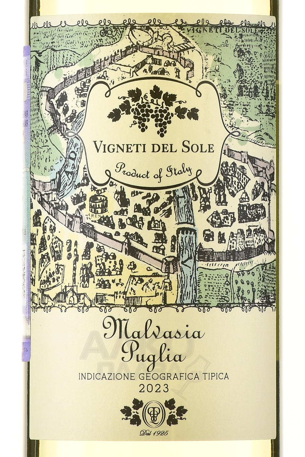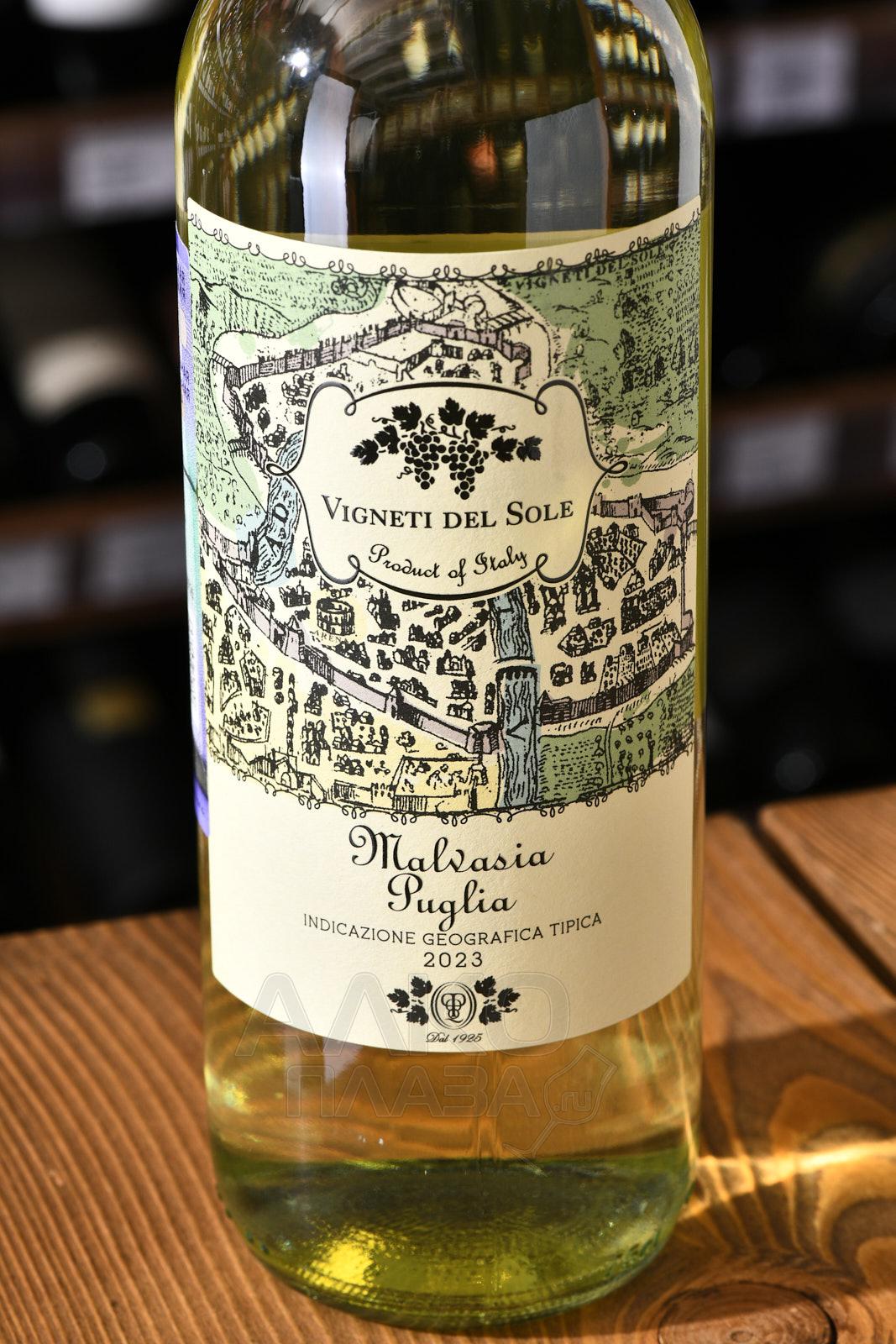 Белое полусухое вино Vigneti del Sole Malvasia Puglia IGT 0,75 л производится на юге Италии, в регионе Апулия, в рамках категории Indicazione Geografica Tipica. Виноград выращивается на равнинных и слегка холмистых участках с известково-глинистыми и аллювиальными почвами, характерными для центральной и южной части региона. Терруар отличается высокой инсоляцией, жарким средиземноморским климатом и влиянием бризов с берегов Адриатического и Ионического морей, что способствует накоплению сахаров и сохранению ароматической выразительности в ягодах. На винификацию идут плоды традиционного для юга Италии сорта. Сбор урожая проводится при оптимальной зрелости. Ферментация проходит в ёмкостях из нержавеющей стали при контролируемой температуре, что позволяет сохранить свежесть и сортовой характер.