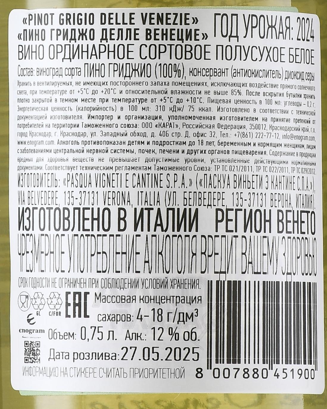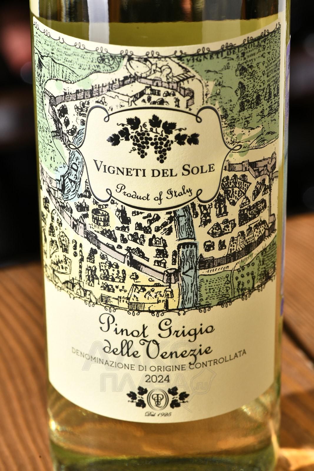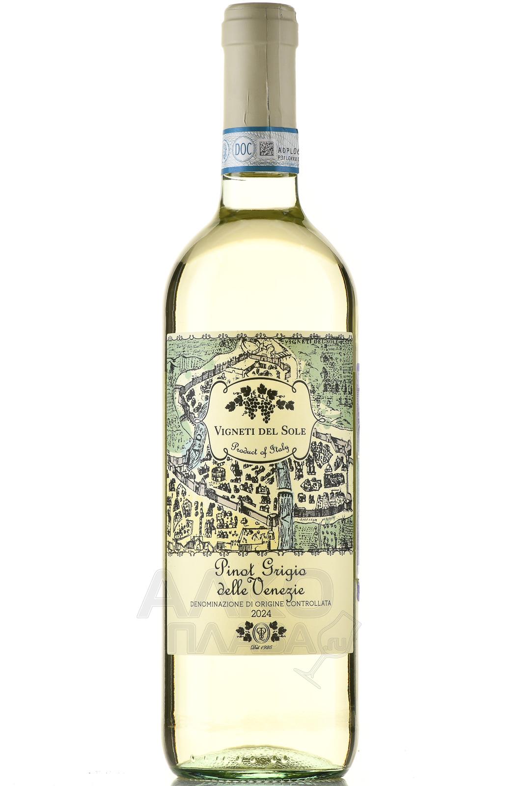 Белое полусухое вино Vigneti del Sole Pinot Grigio delle Venezie 0,75 л — моносортовой напиток с контролируемым наименованием по происхождению DOC Делле Венецие. На производство пошли ягоды с виноградников на северо-востоке Италии. Регион охватывает территории Венето, Фриули-Венеция-Джулия и Трентино–Альто-Адидже. Лозы здесь растут на равнинных и холмистых участках с аллювиальными и глинисто-известковыми почвами в умеренном климате. Альпийские воздушные массы сочетаются с влиянием Адриатического моря, что способствует медленному и равномерному созреванию плодов. Винификация проходит в емкостях из нержавеющей стали при контроле температуры, дуб не используется.