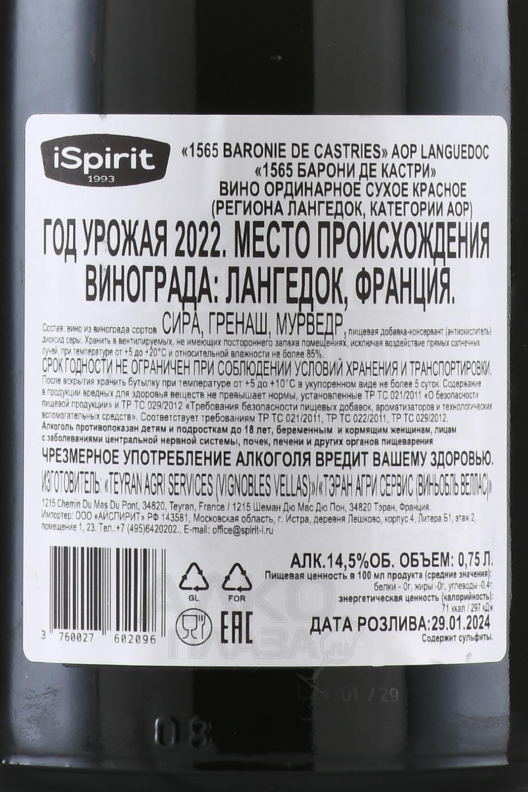 Красное сухое вино Vignobles Vellas 1565 Baronie de Castries Languedoc AOP 0,75 л создано в историческом сердце Лангедока, где виноград выращивают более двух тысяч лет. Название отсылает к году основания баронства Кастри, а сама линейка подчеркивает связь традиции с современной винодельней. Лозы здесь расположены на глинисто-известняковых почвах, насыщенных минералами, которые придают ягодам концентрацию и силу. Средиземноморский климат с мягкой зимой и жарким летом формирует устойчивый вегетационный цикл, а бризы с побережья помогают сохранить свежесть плодов. Собранный вручную урожай винифицируют в традиционном стиле с контролем температуры и последующей выдержкой сброженного сусла.