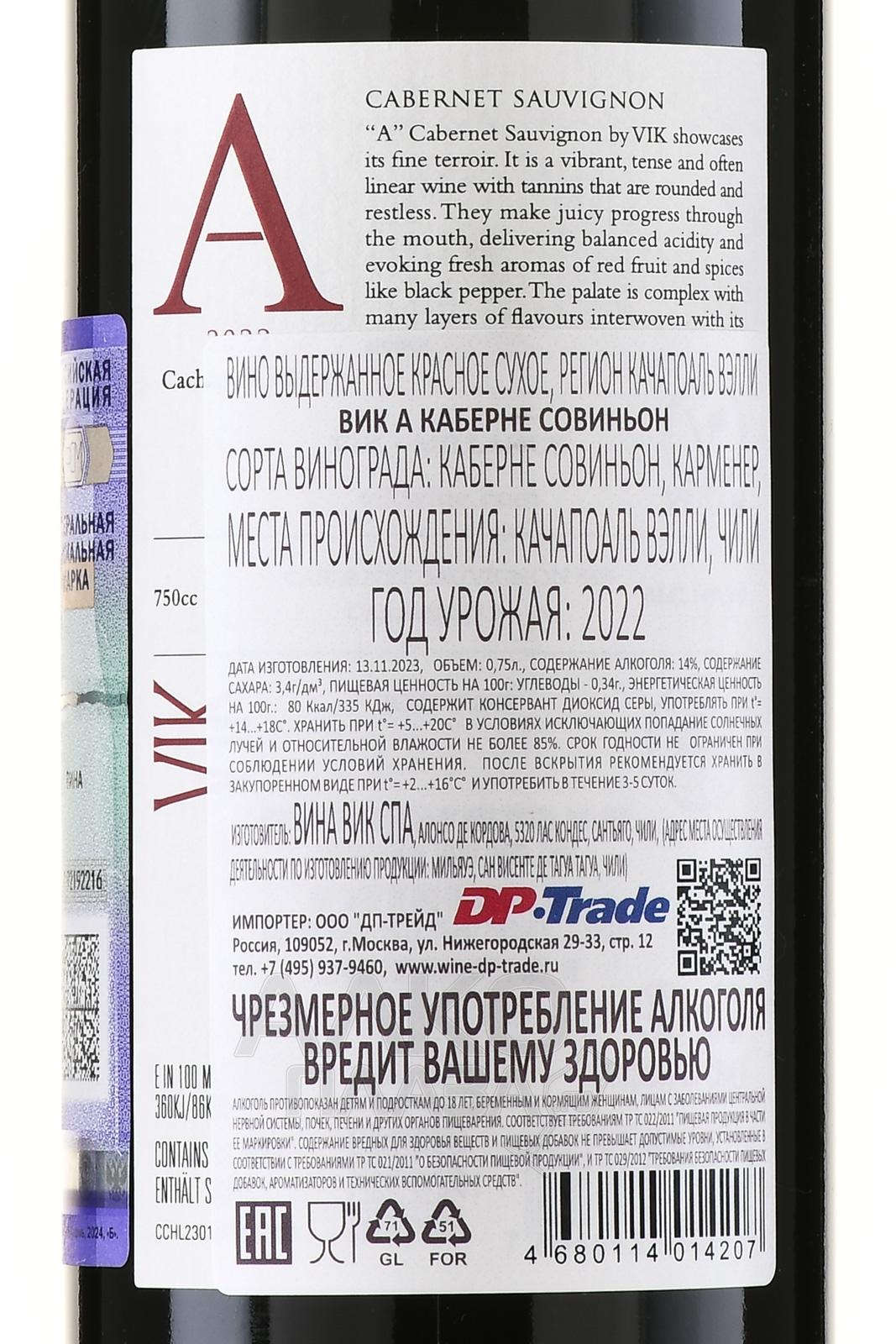 Красное сухое вино Vik A Cabernet Sauvignon 0,75 л — образцовый пример современного чилийского виноделия. Напиток сочетает в своем незаурядном характере силу и благородство. Вино создано на винодельне Вик в долине Millahue (регион Качапоаль Вэлли), где лозы растут на пористых гранитных почвах с отличным дренажем. Климат здесь умеренный, с мягким морским влиянием, благодаря чему ягоды созревают равномерно и сохраняют кислотность. После ручного сбора и сортировки виноград прошел ферментацию с отборными дрожжами. Выдержка длилась 15 месяцев во французском дубе, что придало вкусу гармонию и глубину. Это вино — яркое, чистое и выразительное, с мощной структурой и элегантным профилем, олицетворяющее дух терруара Millahue.