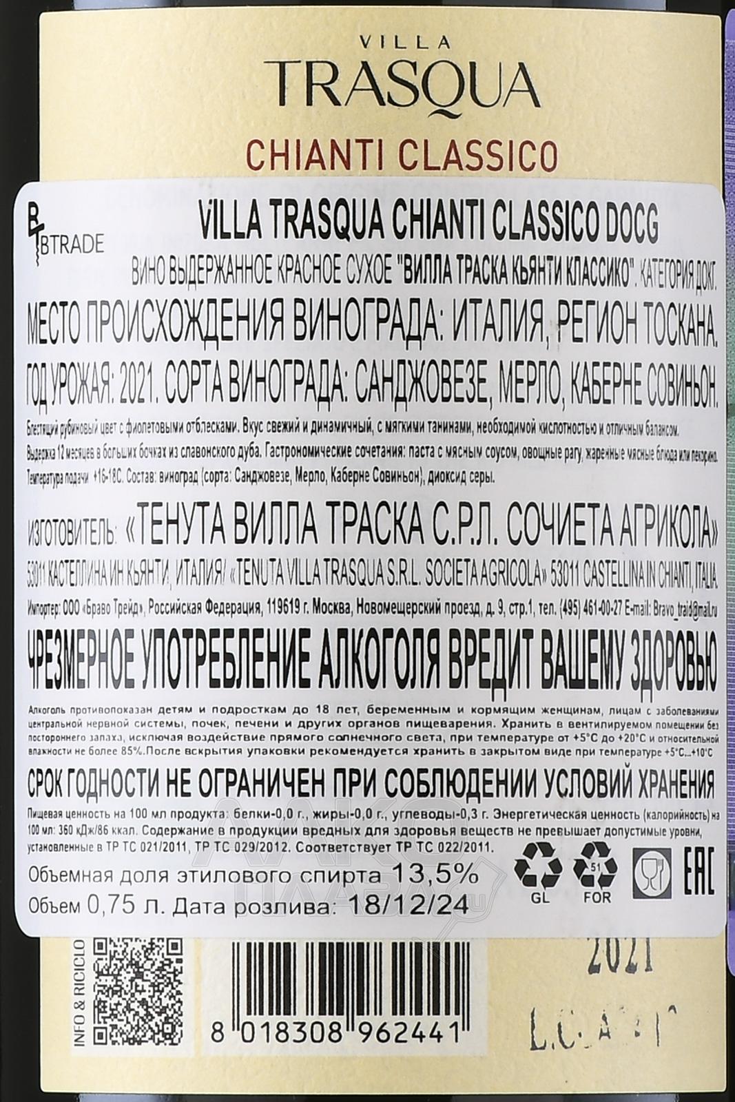 Красное сухое вино Villa Trasqua Chianti Classico 0,75 л скрывает в себе терруар Тосканы, её свет и ветер, утреннюю росу и вечернюю прохладу. Напиток создаётся в зоне Castellina in Chianti, где холмы с глинисто-известняковыми и песчаными почвами возвышаются на высоту от 300 до 500 м над уровнем моря. Виноградники культивируются в климате с тёплыми днями и свежими ночами, что способствует медленному созреванию ягод, накоплению минералов и тонкой кислотности. Урожай собирают вручную, после сортировки проводится мацерация и ферментация на протяжении 20-22 дней при температуре 26-28 °C, а после напиток выдерживается минимум 12 месяцев в больших дубовых бочках объёмом 5000 л.